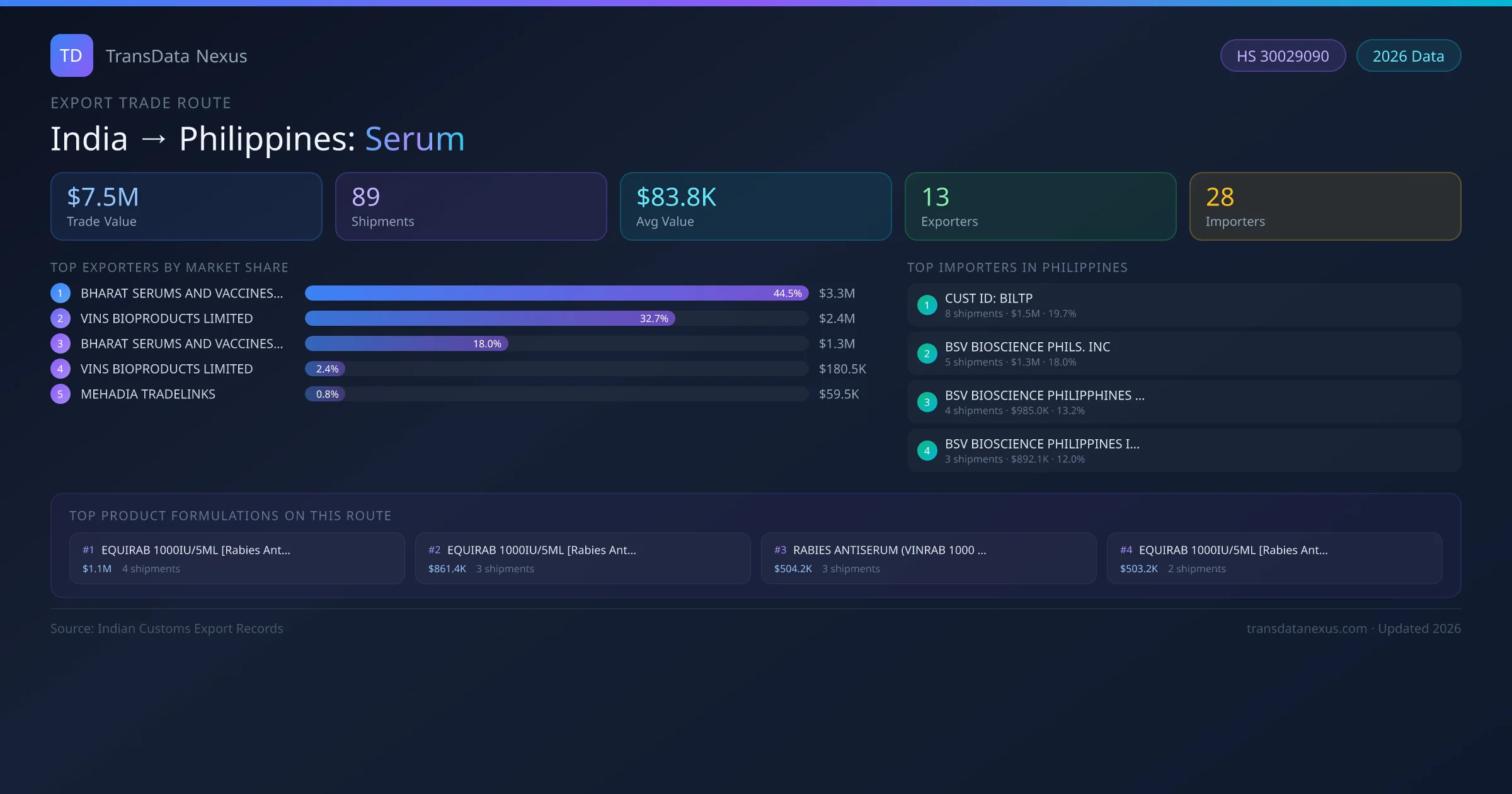 India exports Serum to Philippines worth approximately $7.5M USD across 89 recorded shipments. The average value per shipment is $83.8K USD.