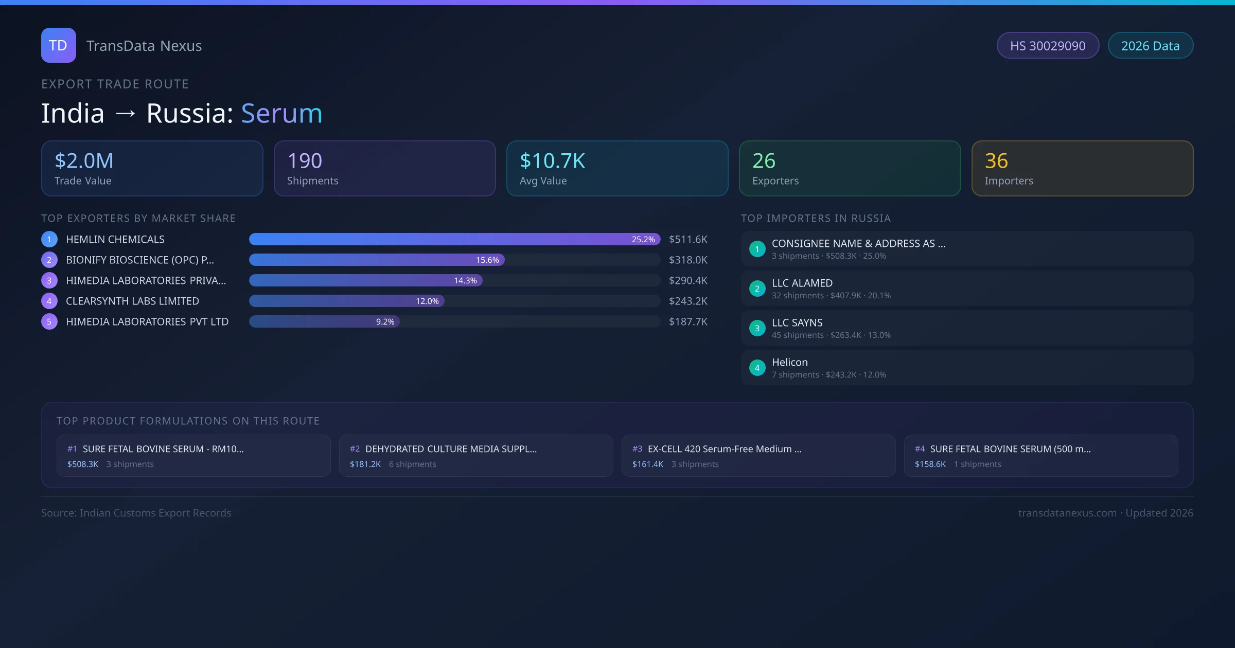 India has recorded 190 verified shipments of Serum exported to Russia, representing a combined trade value of $2.0M USD. This corridor is served by 26 active Indian exporters, with an average shipment value of $10.7K USD. The leading Indian exporter is HEMLIN CHEMICALS, which accounts for 25% of total export value with 4 shipments worth $511.6K USD. On the buying side, CONSIGNEE NAME & ADDRESS AS PER EXP is the largest importer in Russia with $508.3K USD in purchases. The top 3 suppliers — HEMLIN CHEMICALS, BIONIFY BIOSCIENCE (OPC) PRIVATE LIMITED, HIMEDIA LABORATORIES PRIVATE LIMITED — together control 55% of total trade value on this route. All data sourced from Indian Customs (DGFT) shipping bill records. Values reported in FOB USD.