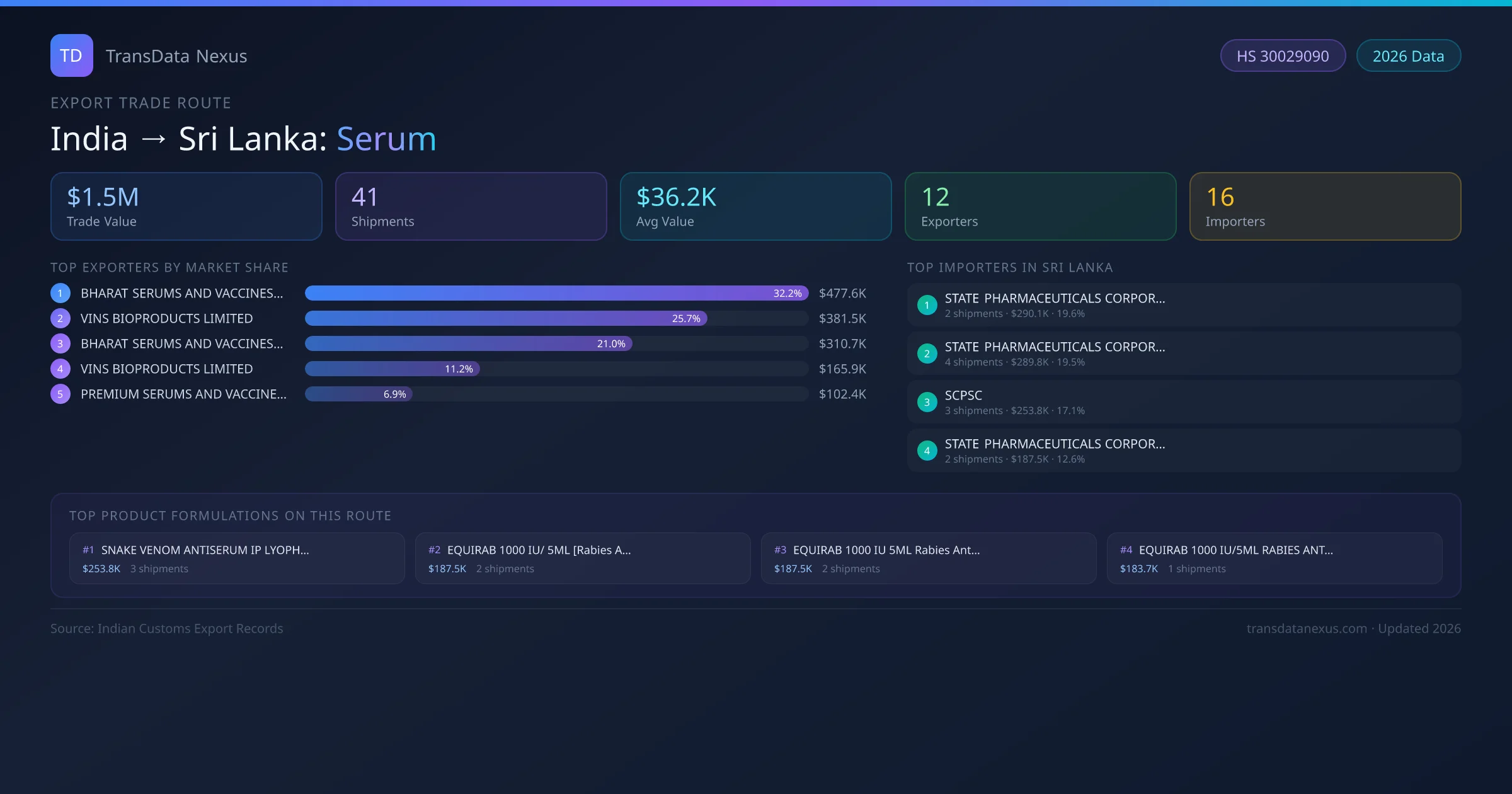 The India to Sri Lanka Serum corridor is one of India's established pharmaceutical export routes, with 41 shipments documented worth a combined $1.5M USD. The route is dominated by BHARAT SERUMS AND VACCINES LIMITED , which alone accounts for roughly 32% of all export value, reflecting the consolidated nature of India's serum manufacturing sector.
