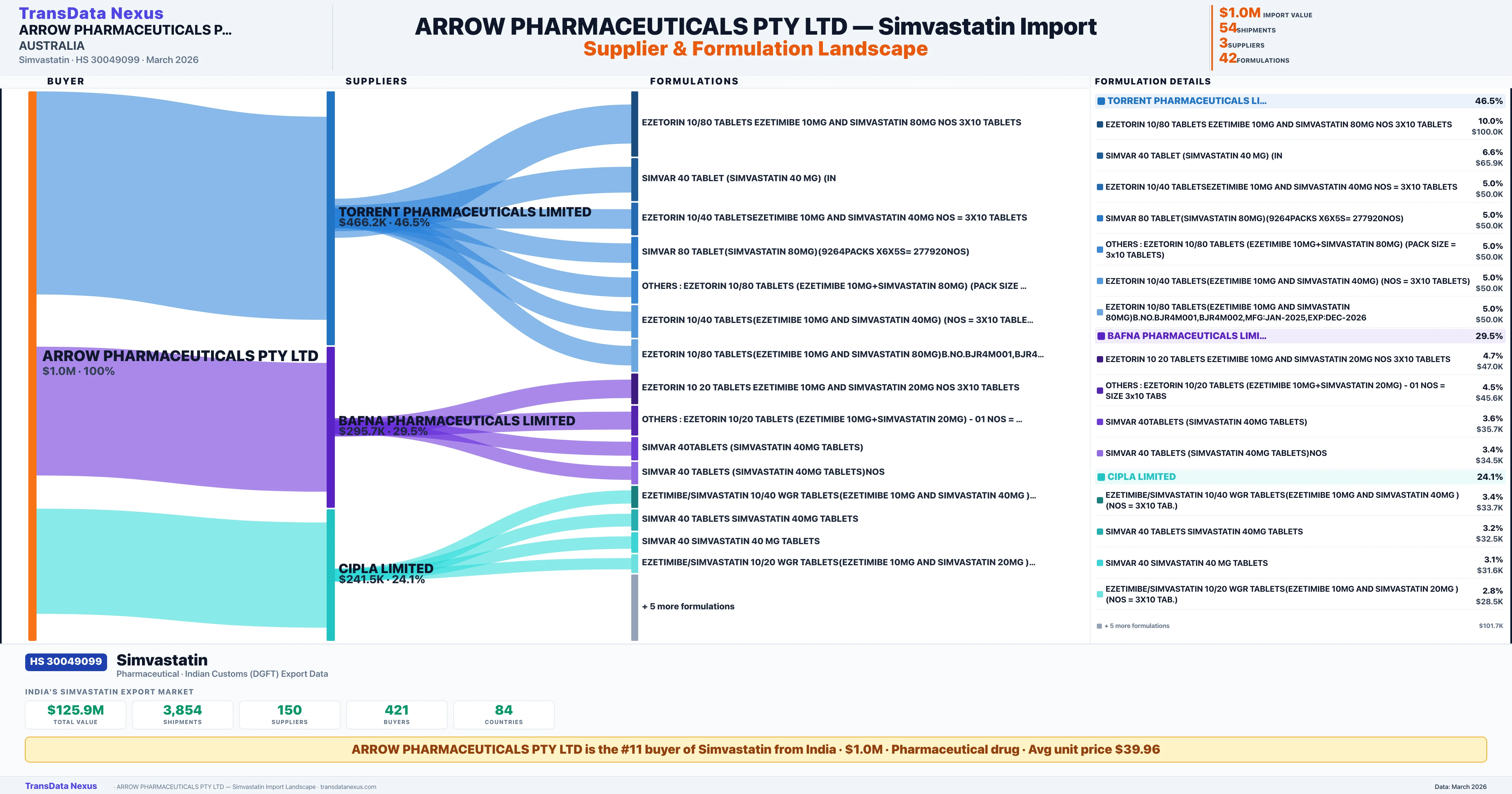 ARROW PHARMACEUTICALS PTY LTD sources Simvastatin from 3 verified Indian suppliers: TORRENT PHARMACEUTICALS LIMITED ($466.2K, 46.5%), BAFNA PHARMACEUTICALS LIMITED ($295.7K, 29.5%), CIPLA LIMITED ($241.5K, 24.1%). This is based on 54 customs records.