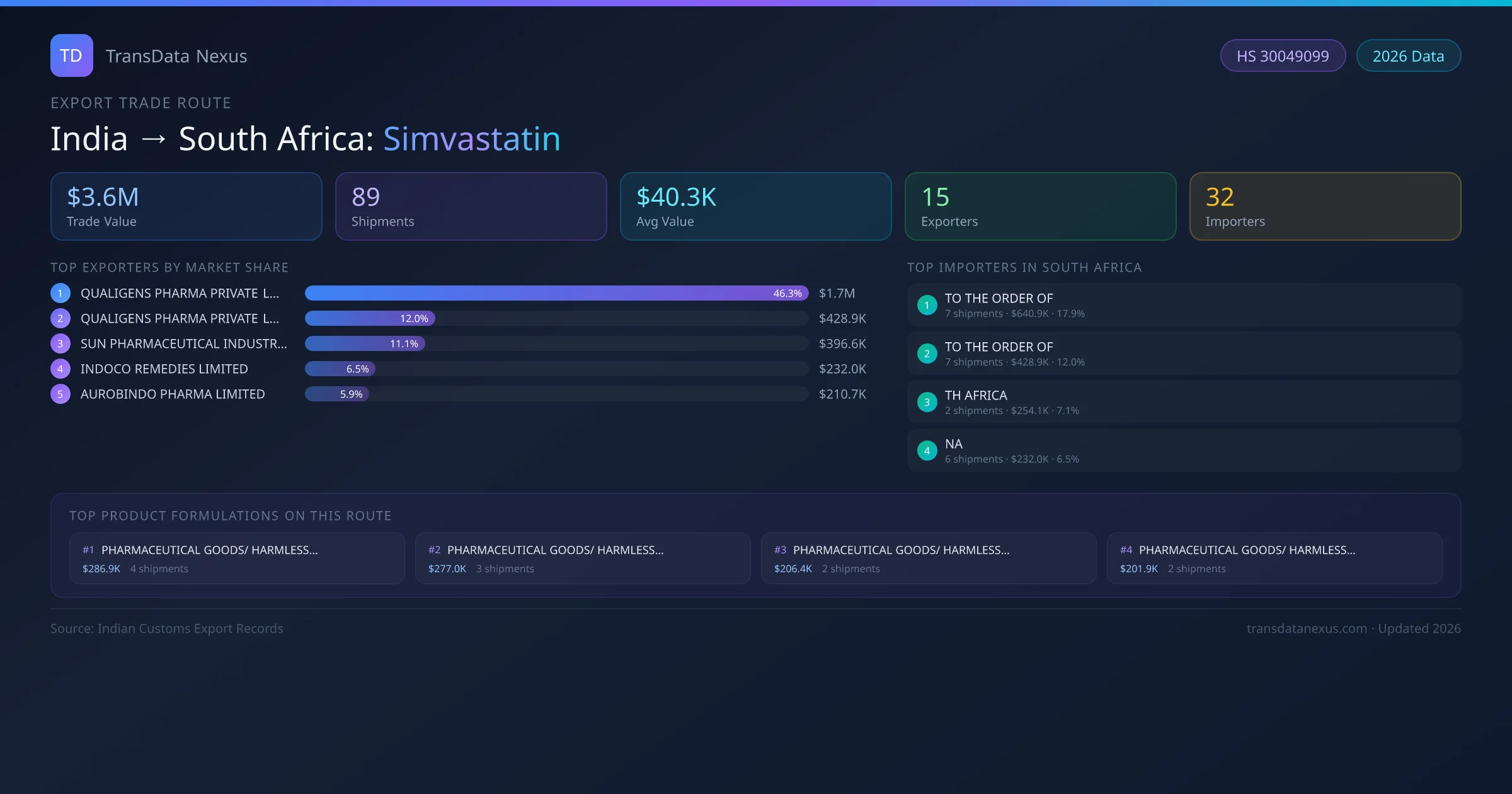 - 1.Route Identification: India to South Africa export trade corridor identified from Indian Customs (DGFT) records for Simvastatin.