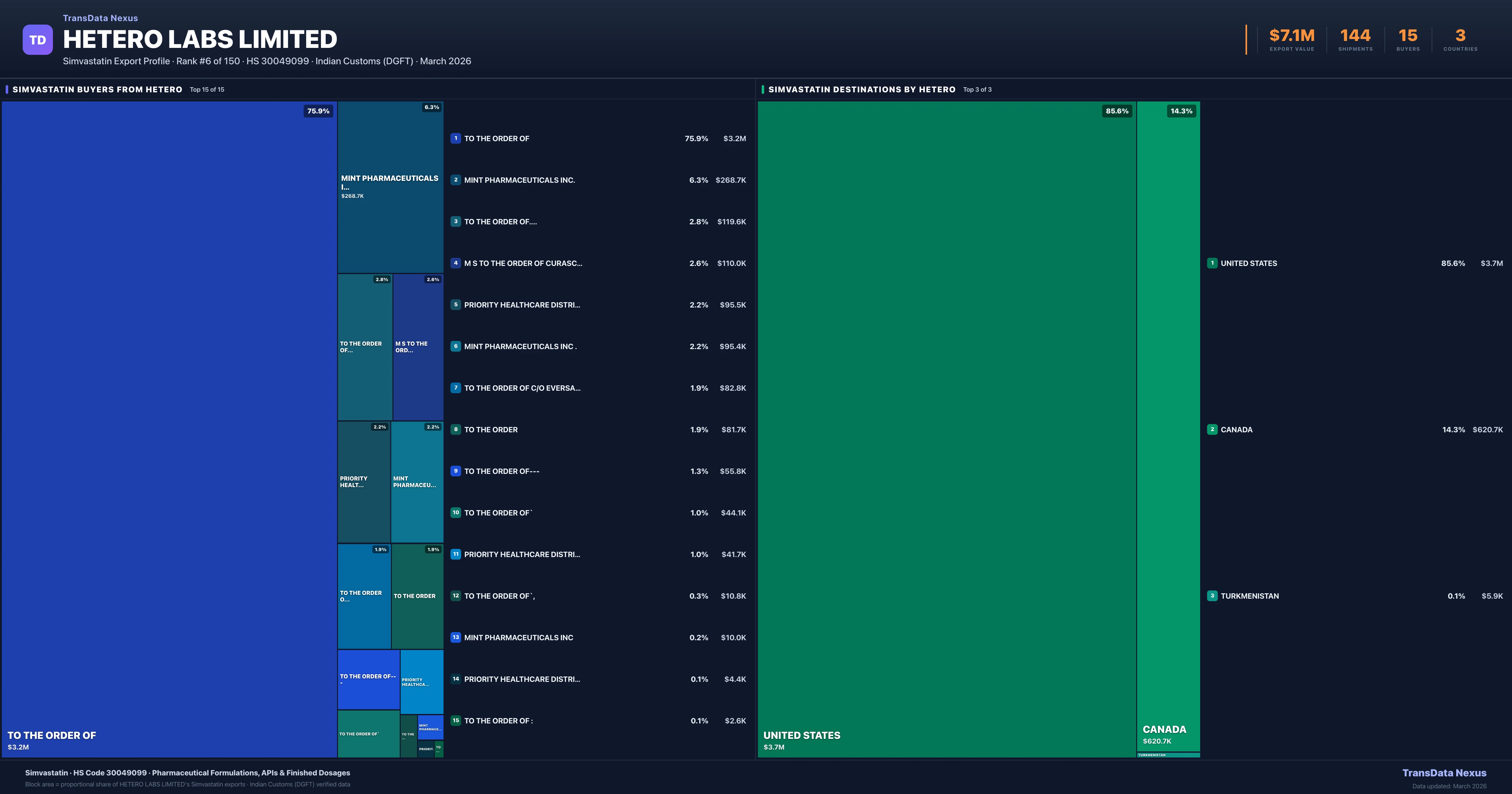 Hetero Labs Limited supplies Simvastatin to 15 buyers globally. The largest buyer is TO THE ORDER OF (UNITED STATES), followed by MINT PHARMACEUTICALS INC. (CANADA) and TO THE ORDER OF.... (UNITED STATES). These buyers represent pharmaceutical distributors, hospital groups, and government procurement agencies in their respective markets.