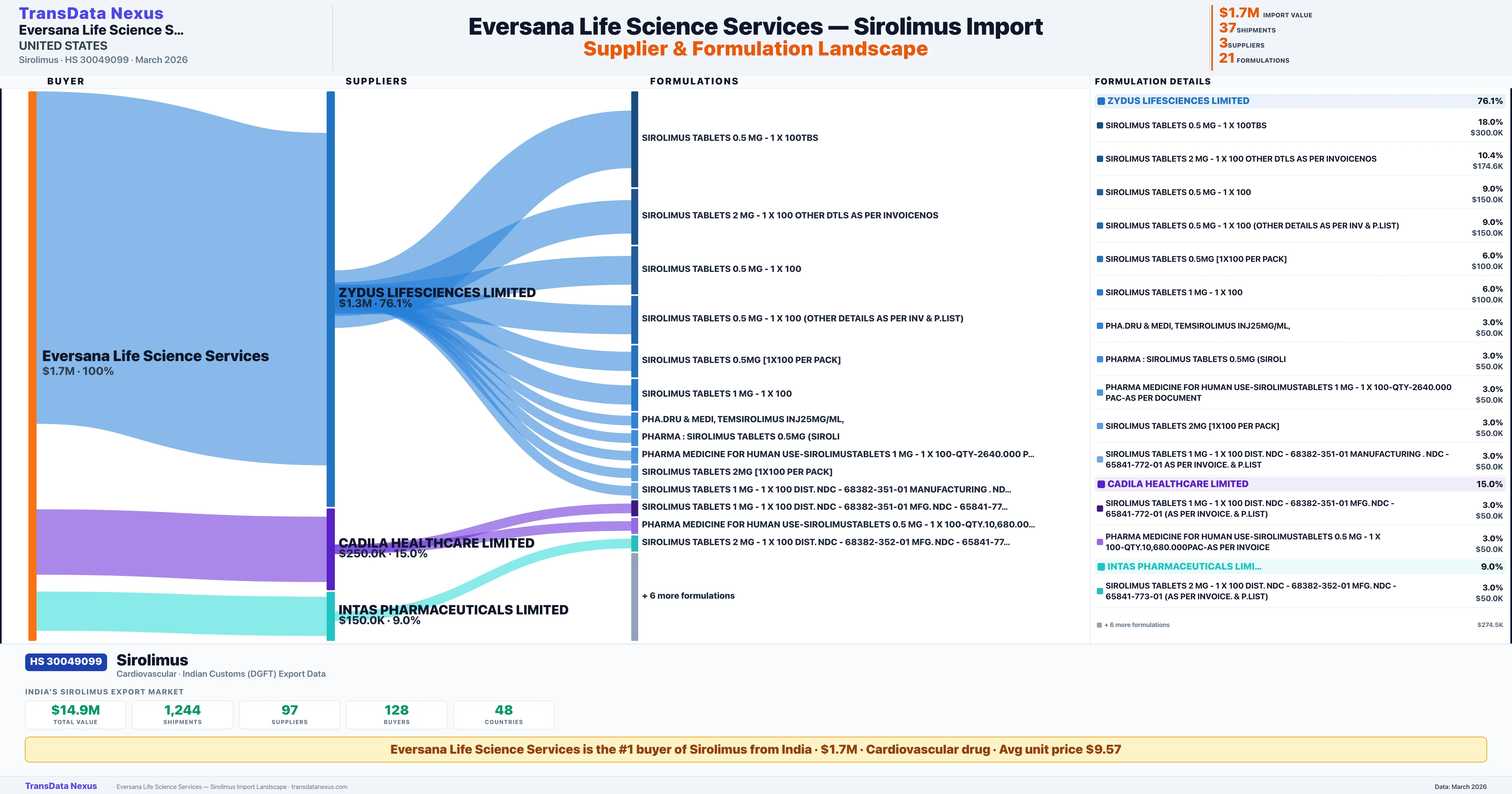EVERSANA LIFE SCIENCE SERVICES sources Sirolimus from 3 verified Indian suppliers: ZYDUS LIFESCIENCES LIMITED ($1.3M, 76.1%), CADILA HEALTHCARE LIMITED ($250.0K, 15.0%), INTAS PHARMACEUTICALS LIMITED ($150.0K, 9.0%). This is based on 37 customs records.