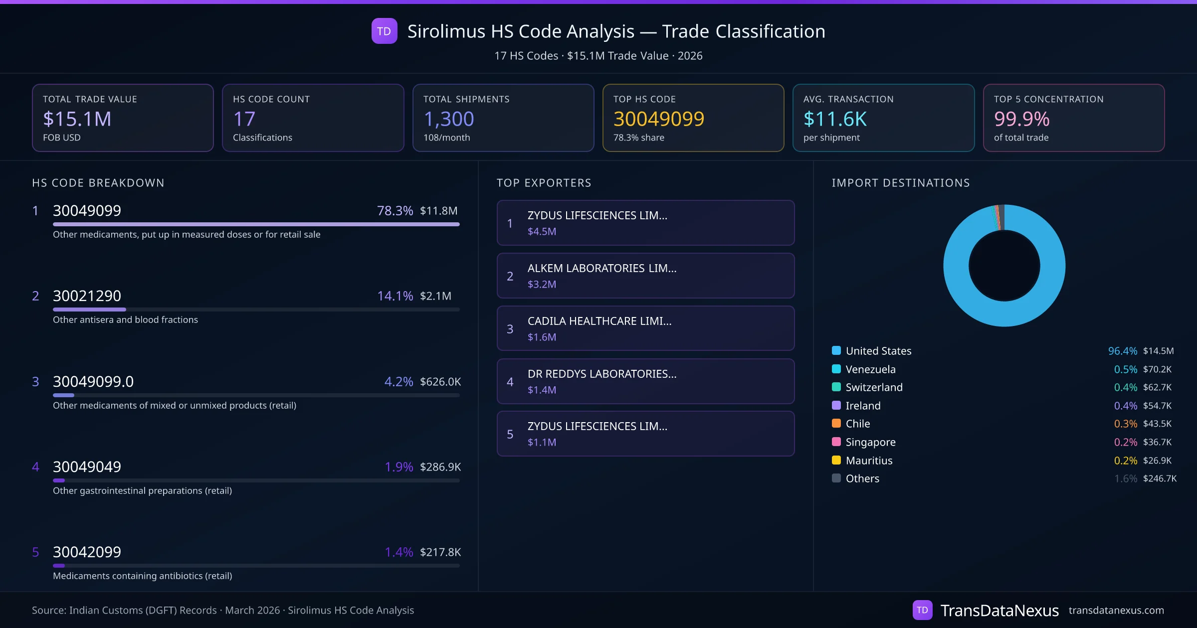India exports Sirolimus under 17 distinct HS code classifications, representing a total trade value of $15.1M across 1,300 shipments. The dominant classification is HS 30049099 (Other medicaments, put up in measured doses or for retail sale), accounting for 78.3% of all Sirolimus trade at $11.8M. HS 30021290 (Other antisera and blood fractions) follows at 14.1% ($2.1M). The top 5 HS codes together account for 99.9% of total Sirolimus trade from India. The average transaction value is $11584. Key importing markets include United States, Venezuela, Switzerland. Leading exporters include ZYDUS LIFESCIENCES LIMITED and ALKEM LABORATORIES LIMITED. Data sourced from Indian Customs (DGFT) shipping bill records.