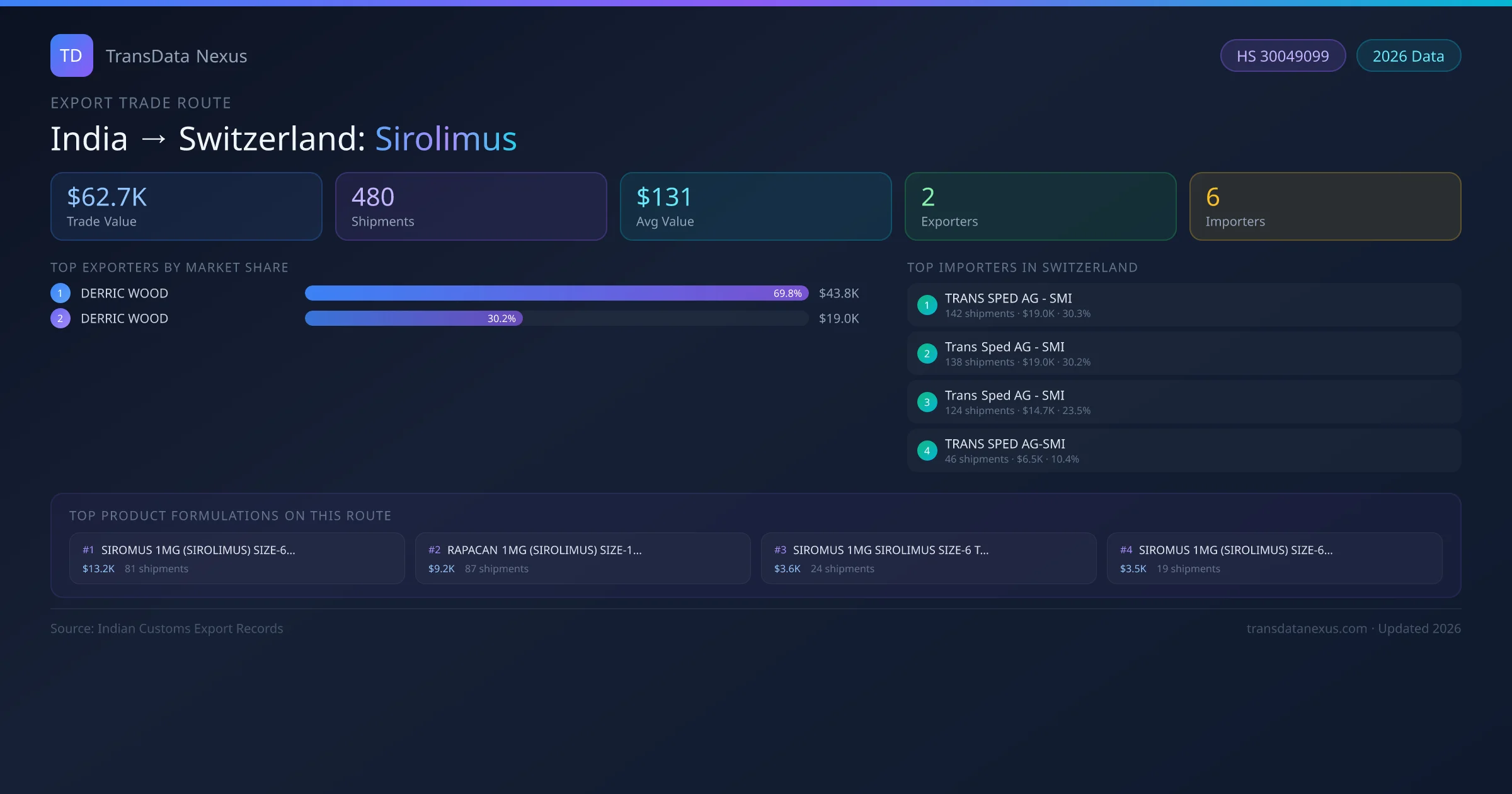 The India to Switzerland Sirolimus corridor is one of India's established pharmaceutical export routes, with 480 shipments documented worth a combined $62.7K USD. The route is dominated by DERRIC WOOD, which alone accounts for roughly 70% of all export value, reflecting the consolidated nature of India's sirolimus manufacturing sector.