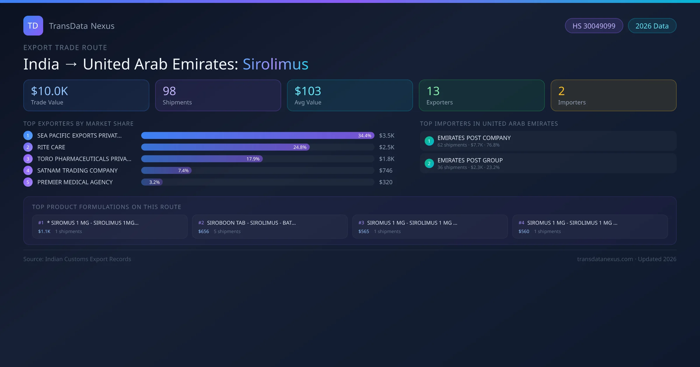 The India to United Arab Emirates Sirolimus corridor is one of India's established pharmaceutical export routes, with 98 shipments documented worth a combined $10.0K USD. The route is dominated by SEA PACIFIC EXPORTS PRIVATE LIMITED, which alone accounts for roughly 34% of all export value, reflecting the consolidated nature of India's sirolimus manufacturing sector.