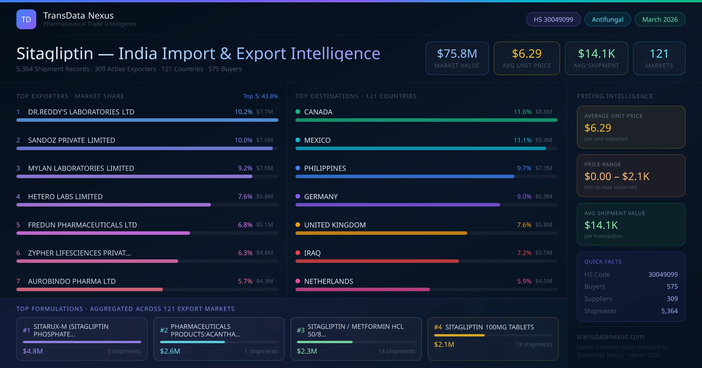 Between 2022 and 2026, India exported $75.8M worth of sitagliptin across 5,364 verified shipments to 121 countries — covering 62% of world markets in the Diabetes & Endocrine segment. The largest destination is CANADA (11.6%). DR.REDDY'S LABORATORIES LTD leads with a 10.2% share. All figures are drawn from Indian Customs (DGFT) shipping bill records spanning four years of trade activity.
