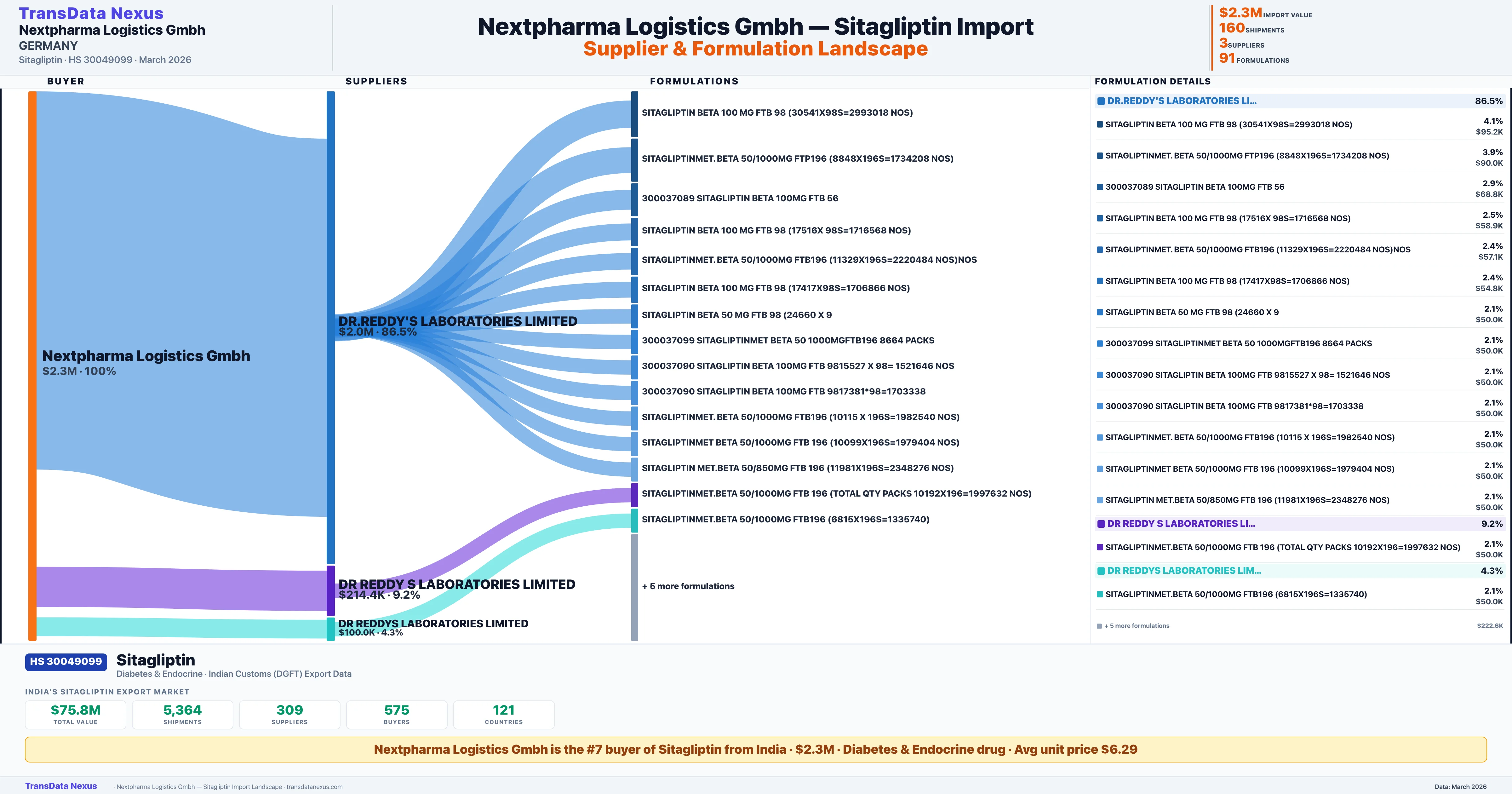 NEXTPHARMA LOGISTICS GMBH sources Sitagliptin from 3 verified Indian suppliers: DR.REDDY'S LABORATORIES LIMITED ($2.0M, 86.5%), DR REDDY S LABORATORIES LIMITED ($214.4K, 9.2%), DR REDDYS LABORATORIES LIMITED ($100.0K, 4.3%). This is based on 160 customs records.