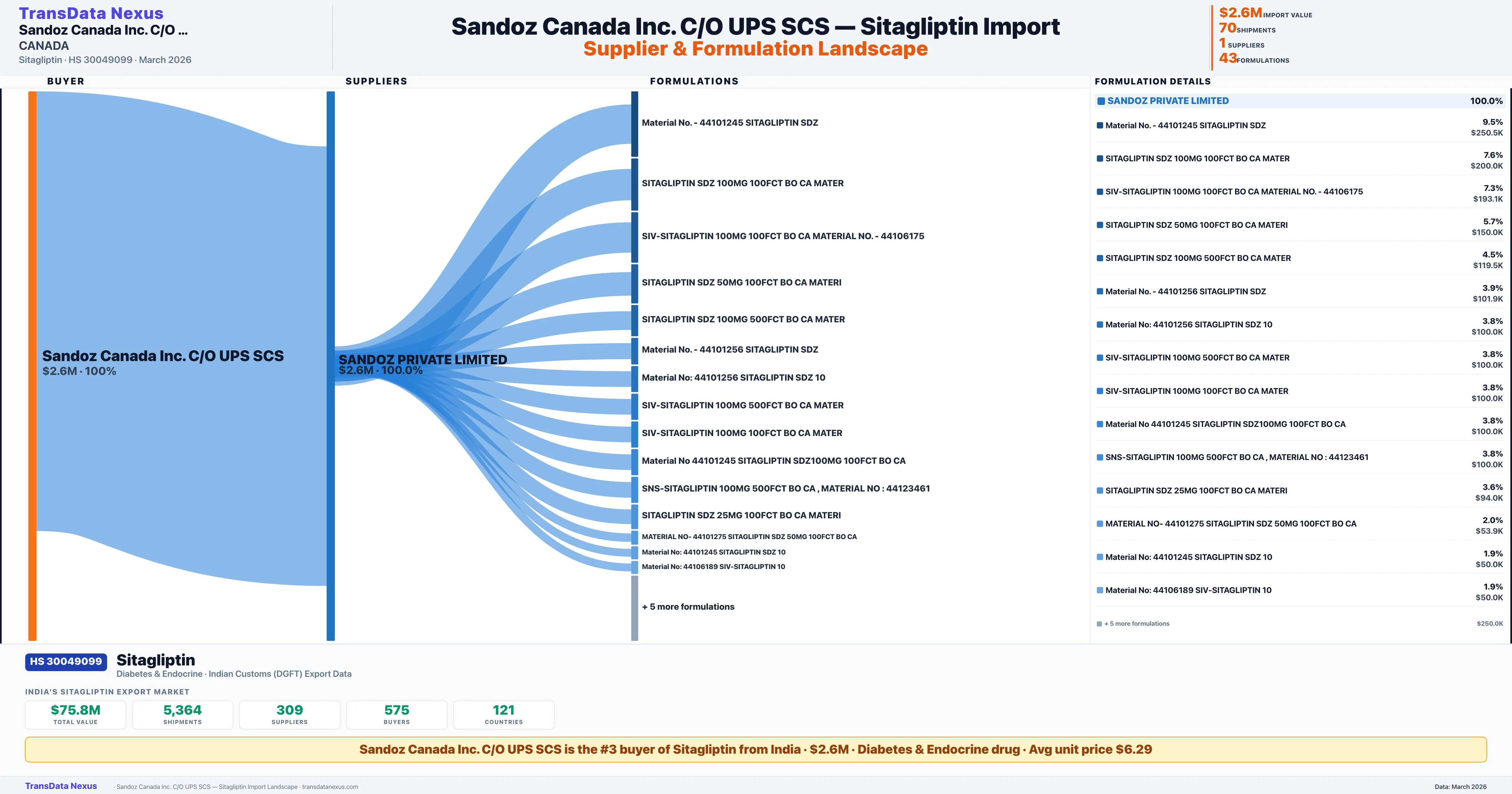 SANDOZ CANADA INC. C/O UPS SCS sources Sitagliptin from 1 verified Indian supplier: SANDOZ PRIVATE LIMITED ($2.6M, 100.0%). This is based on 70 customs records.