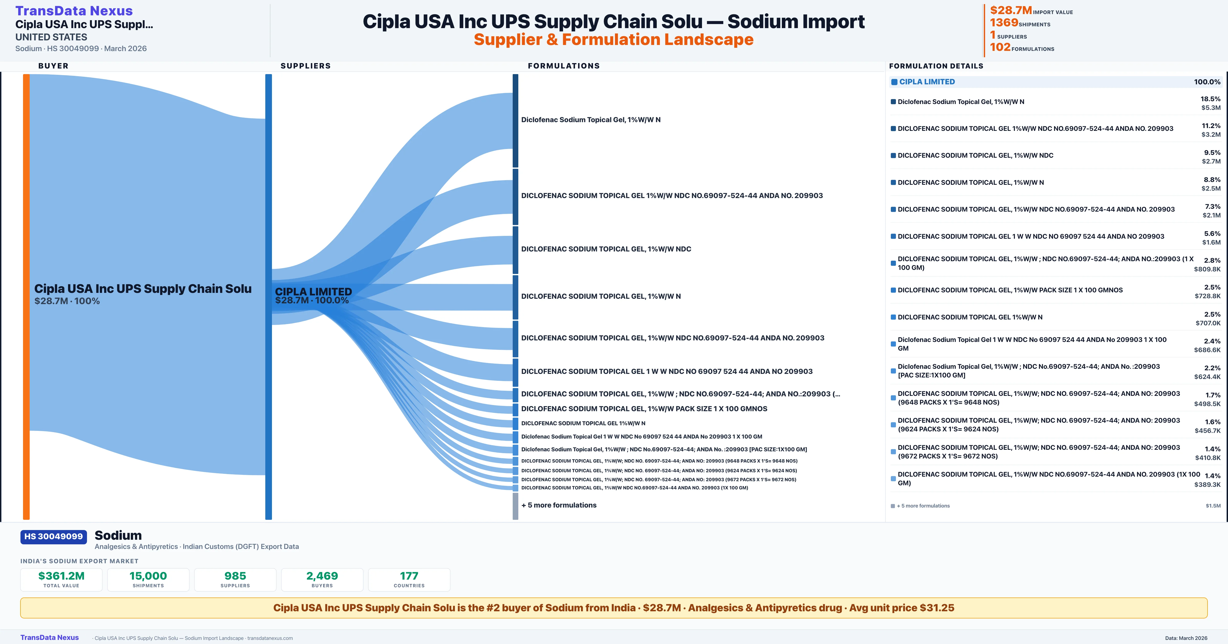 CIPLA USA INC UPS SUPPLY CHAIN SOLU sources Sodium from 1 verified Indian supplier: CIPLA LIMITED ($28.7M, 100.0%). This is based on 1,369 customs records.