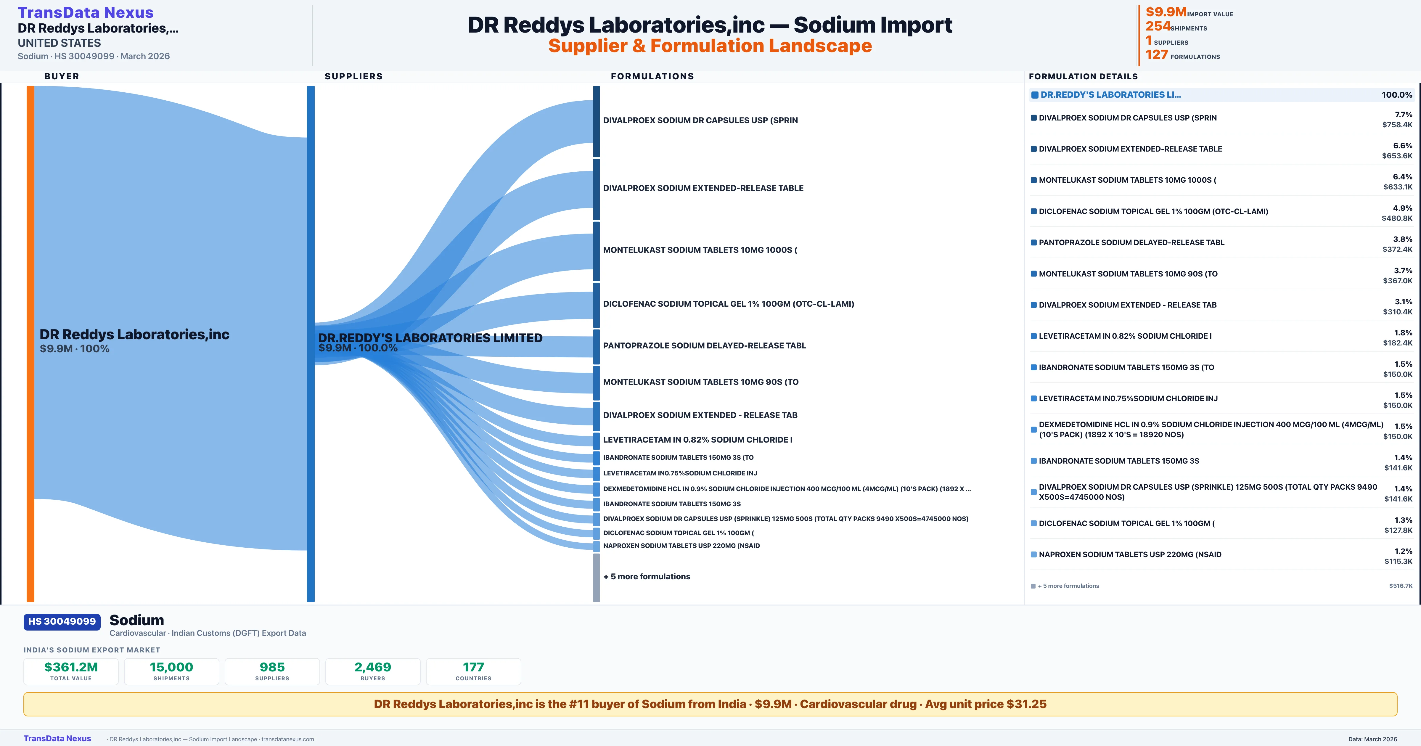 DR. REDDYS LABORATORIES, INC imports 127 distinct Sodium formulations from India. The top formulation is DIVALPROEX SODIUM DR CAPSULES USP (SPRIN with 18 shipments worth $758.4K.