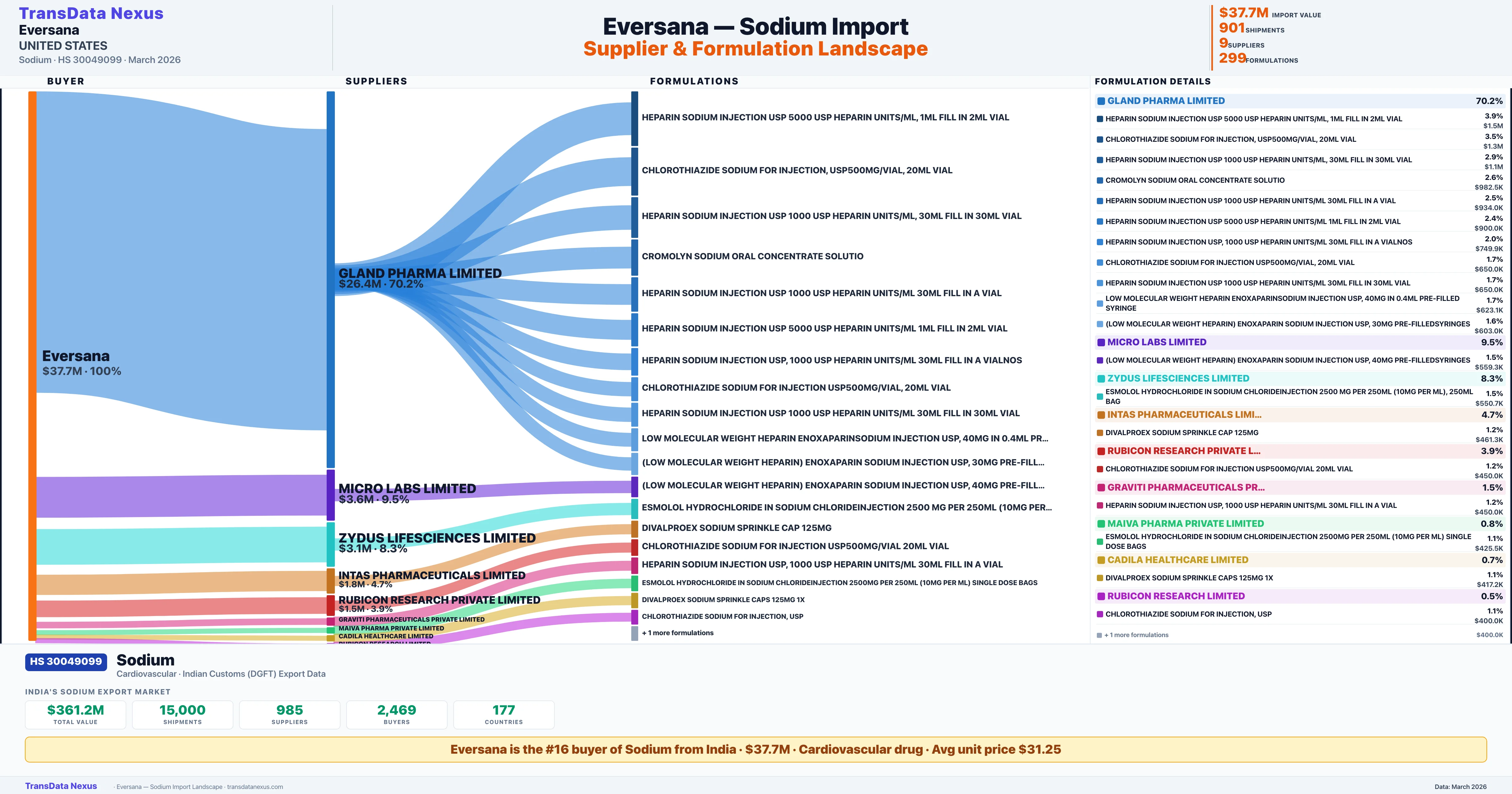 EVERSANA sources Sodium from 9 verified Indian suppliers: GLAND PHARMA LIMITED ($26.4M, 70.2%), MICRO LABS LIMITED ($3.6M, 9.5%), ZYDUS LIFESCIENCES LIMITED ($3.1M, 8.3%), INTAS PHARMACEUTICALS LIMITED ($1.8M, 4.7%), RUBICON RESEARCH PRIVATE LIMITED ($1.5M, 3.9%). This is based on 901 customs records.