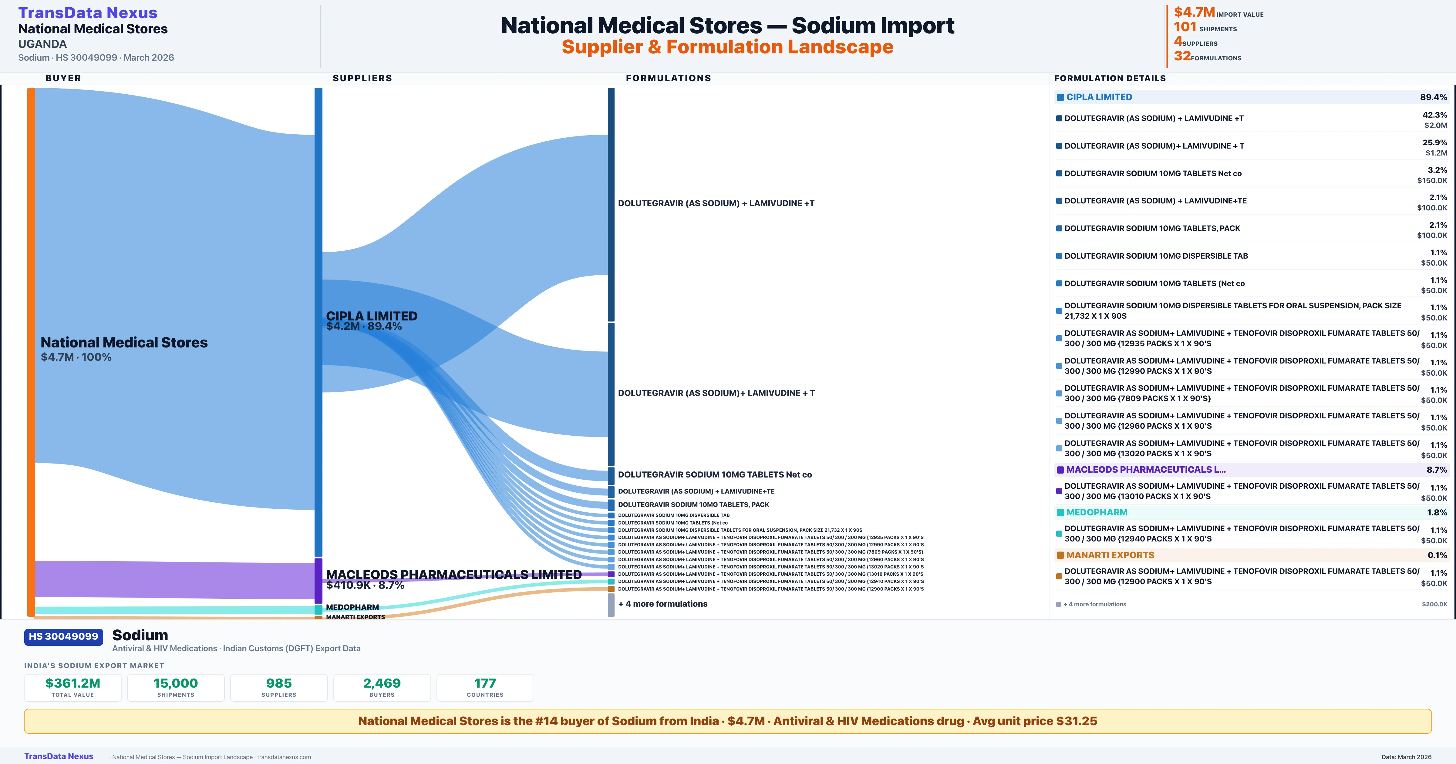 NATIONAL MEDICAL STORES imports 32 distinct Sodium formulations from India. The top formulation is DOLUTEGRAVIR (AS SODIUM) + LAMIVUDINE +T with 42 shipments worth $2.0M.