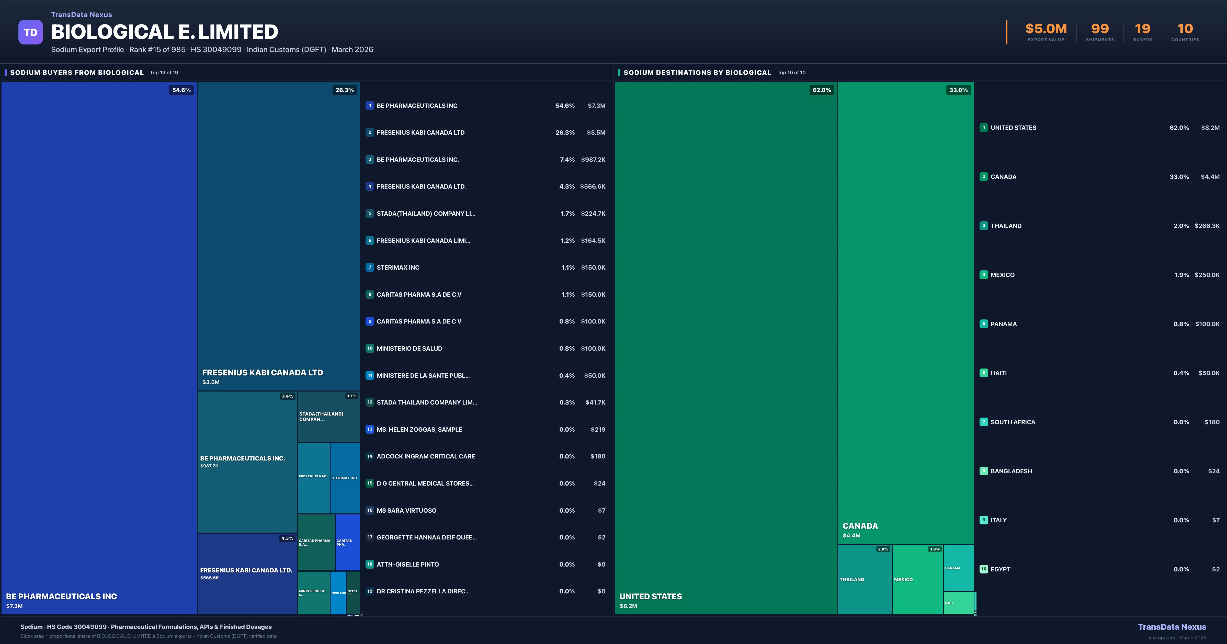 Biological E. Limited supplies Sodium to 19 buyers globally. The largest buyer is BE PHARMACEUTICALS INC (UNITED STATES), followed by FRESENIUS KABI CANADA LTD (CANADA) and BE PHARMACEUTICALS INC. (UNITED STATES). These buyers represent pharmaceutical distributors, hospital groups, and government procurement agencies in their respective markets.