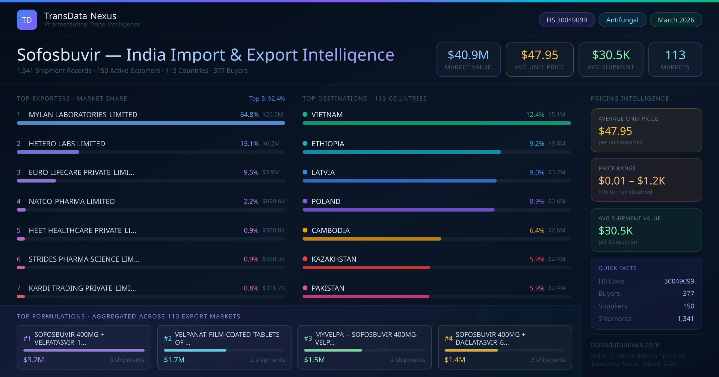 Between 2022 and 2026, India exported $40.9M worth of sofosbuvir across 1,341 verified shipments to 113 countries — covering 58% of world markets in the Antiviral & HIV Medications segment. The largest destination is VIETNAM (12.4%). MYLAN LABORATORIES LIMITED leads with a 64.8% share. All figures are drawn from Indian Customs (DGFT) shipping bill records spanning four years of trade activity.