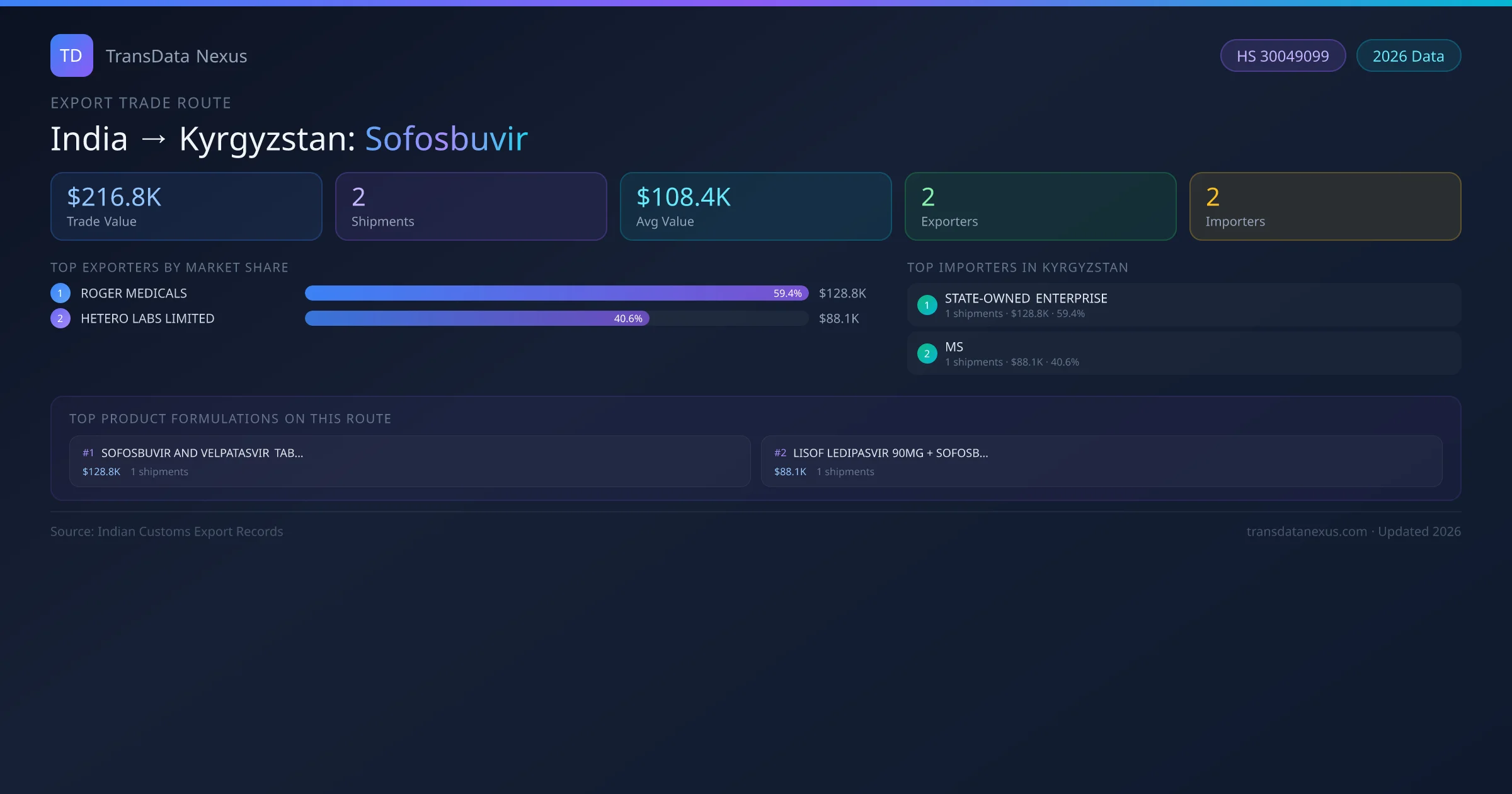 India has recorded 2 verified shipments of Sofosbuvir exported to Kyrgyzstan, representing a combined trade value of $216.8K USD. This corridor is served by 2 active Indian exporters, with an average shipment value of $108.4K USD. The leading Indian exporter is ROGER MEDICALS, which accounts for 59% of total export value with 1 shipments worth $128.8K USD. On the buying side, STATE-OWNED ENTERPRISE is the largest importer in Kyrgyzstan with $128.8K USD in purchases. All data sourced from Indian Customs (DGFT) shipping bill records. Values reported in FOB USD.