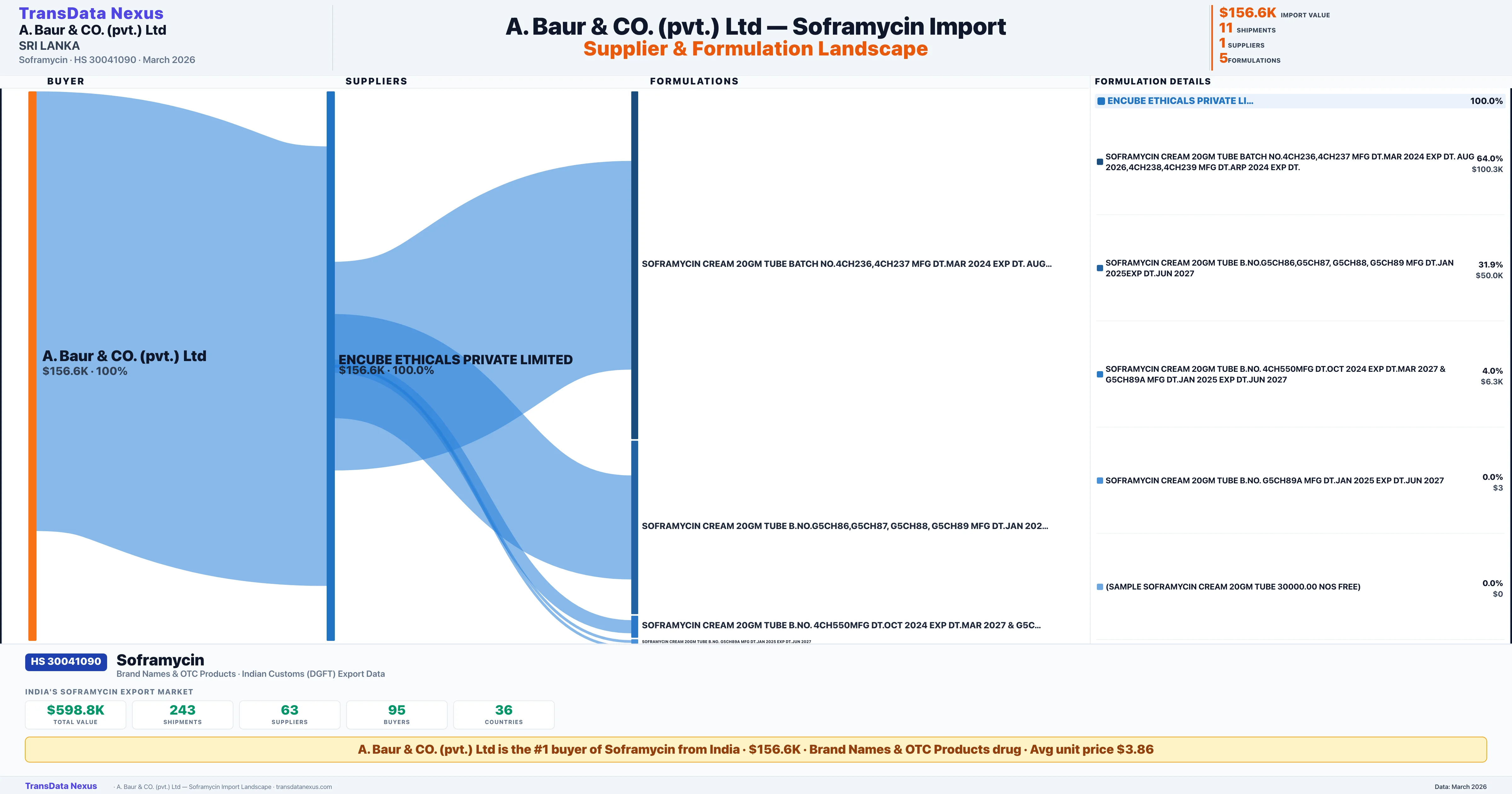 A. BAUR & CO. (PVT.) LTD sources Soframycin from 1 verified Indian supplier: ENCUBE ETHICALS PRIVATE LIMITED ($156.6K, 100.0%). This is based on 11 customs records.