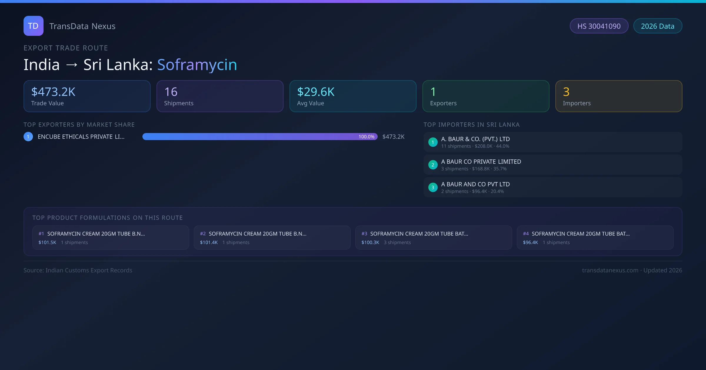 India has recorded 16 verified shipments of Soframycin exported to Sri Lanka, representing a combined trade value of $473.2K USD. This corridor is served by 1 active Indian exporters, with an average shipment value of $29.6K USD. The leading Indian exporter is ENCUBE ETHICALS PRIVATE LIMITED, which accounts for 100% of total export value with 16 shipments worth $473.2K USD. On the buying side, A. BAUR & CO. (PVT.) LTD is the largest importer in Sri Lanka with $208.0K USD in purchases. All data sourced from Indian Customs (DGFT) shipping bill records. Values reported in FOB USD.