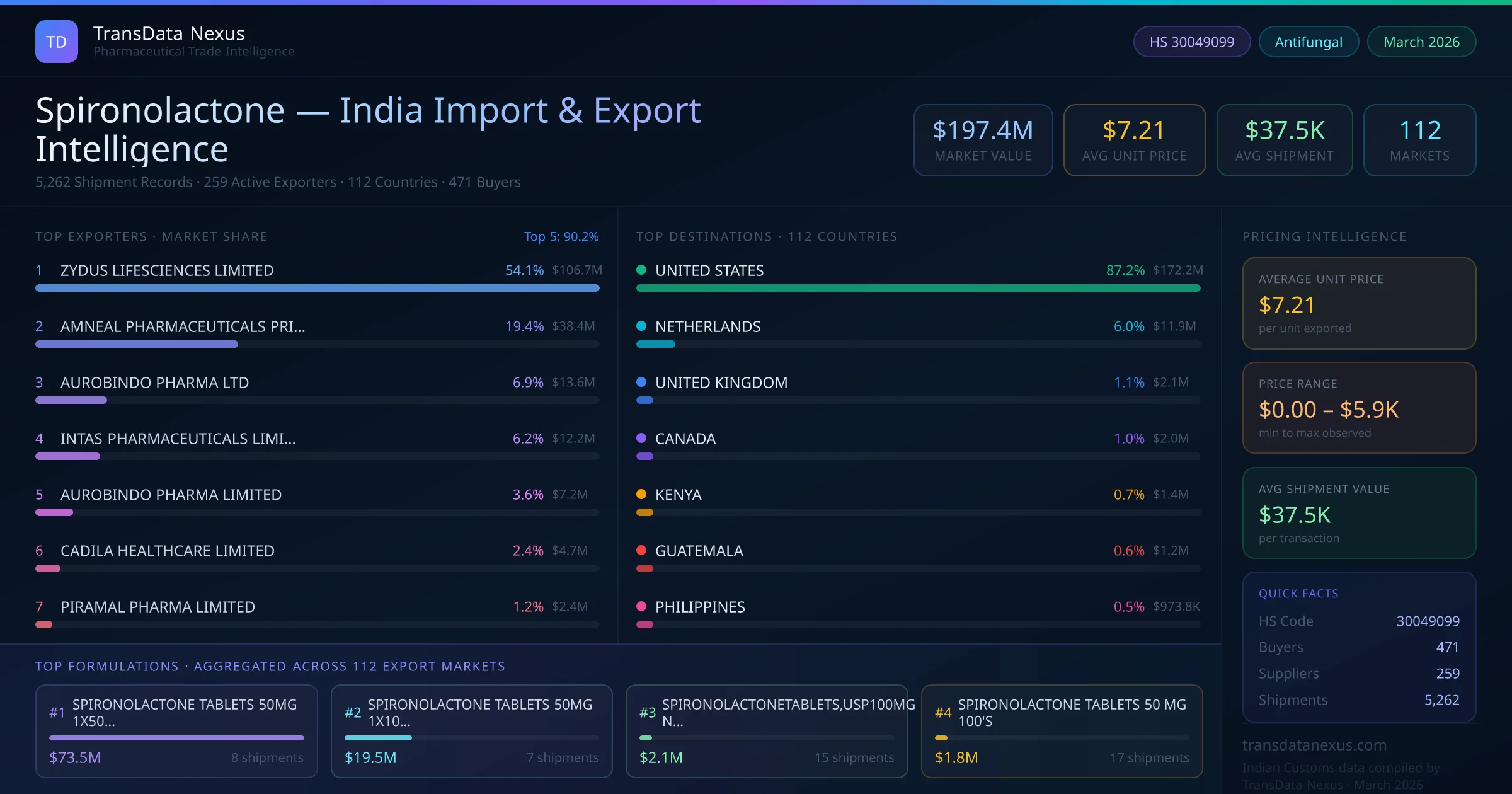 The total export value of spironolactone from India is $197.4M, recorded across 5,262 shipments from 259 active exporters to 112 countries. The average shipment value is $37.5K.