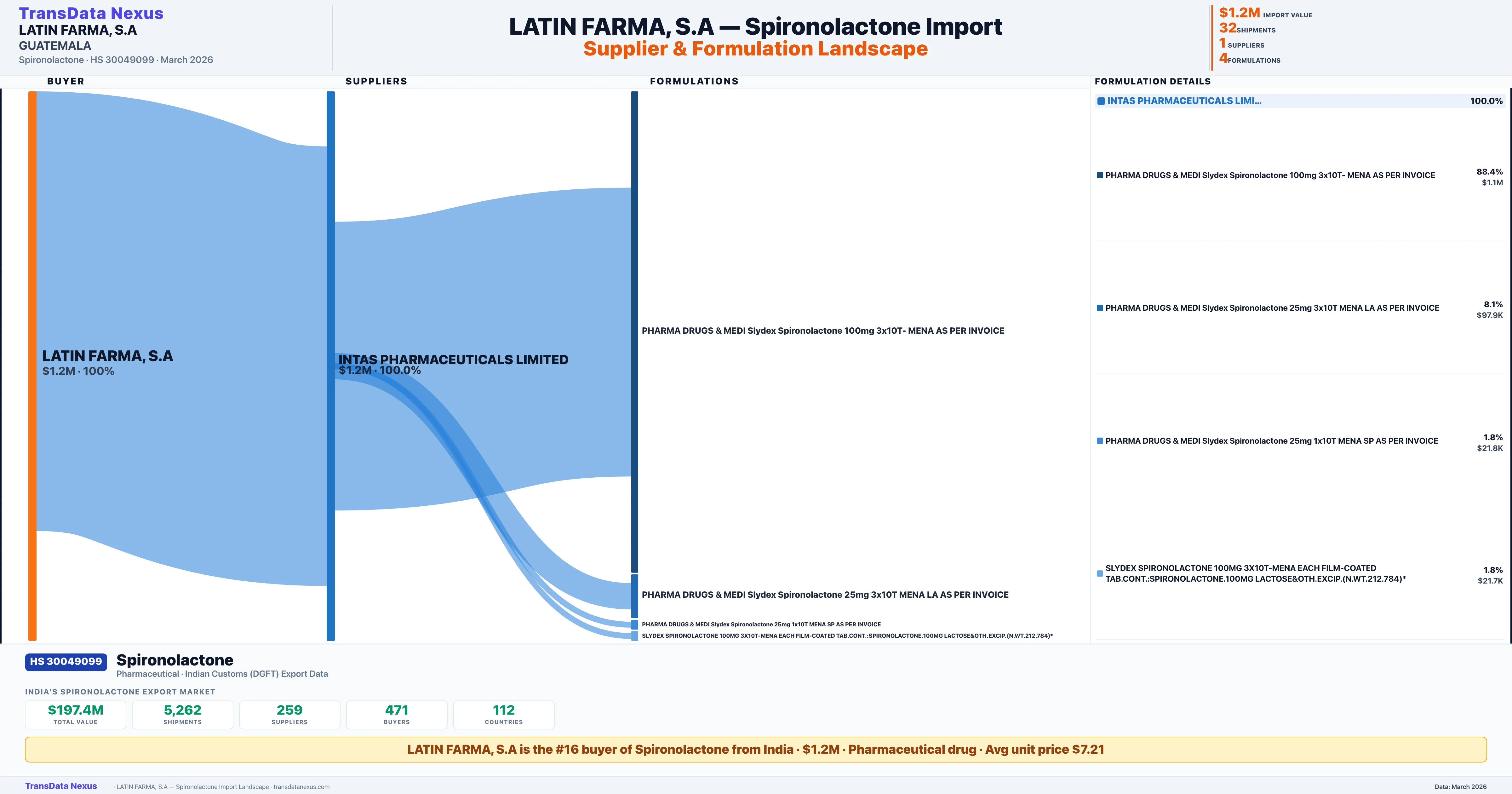 LATIN FARMA, S.A sources Spironolactone from 1 verified Indian supplier: INTAS PHARMACEUTICALS LIMITED ($1.2M, 100.0%). This is based on 32 customs records.