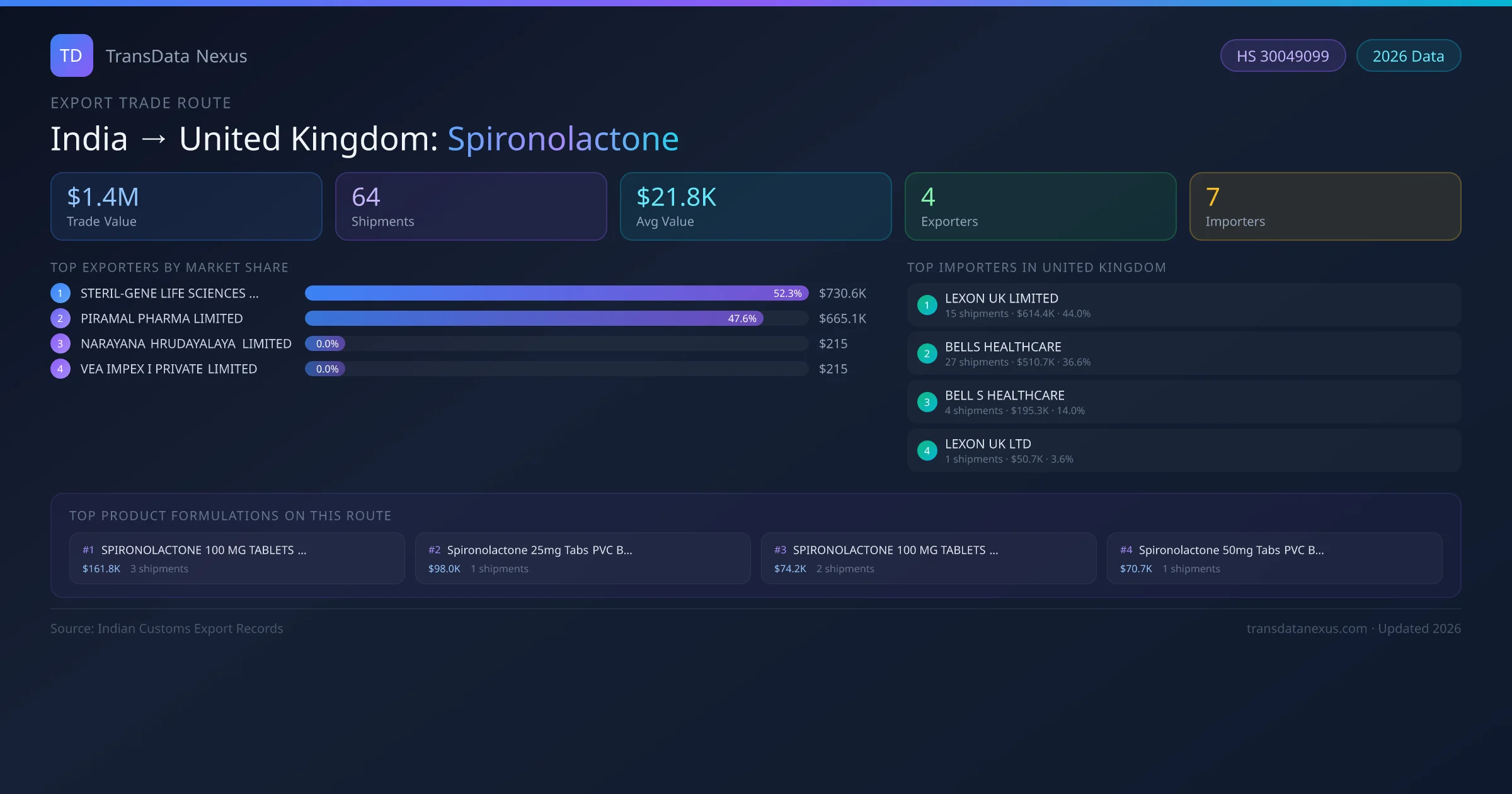 India has recorded 64 verified shipments of Spironolactone exported to United Kingdom, representing a combined trade value of $1.4M USD. This corridor is served by 4 active Indian exporters, with an average shipment value of $21.8K USD. The leading Indian exporter is STERIL-GENE LIFE SCIENCES PRIVATE LIMITED, which accounts for 52% of total export value with 32 shipments worth $730.6K USD. On the buying side, LEXON UK LIMITED is the largest importer in United Kingdom with $614.4K USD in purchases. The top 3 suppliers — STERIL-GENE LIFE SCIENCES PRIVATE LIMITED, PIRAMAL PHARMA LIMITED, NARAYANA HRUDAYALAYA LIMITED — together control 100% of total trade value on this route. All data sourced from Indian Customs (DGFT) shipping bill records. Values reported in FOB USD.