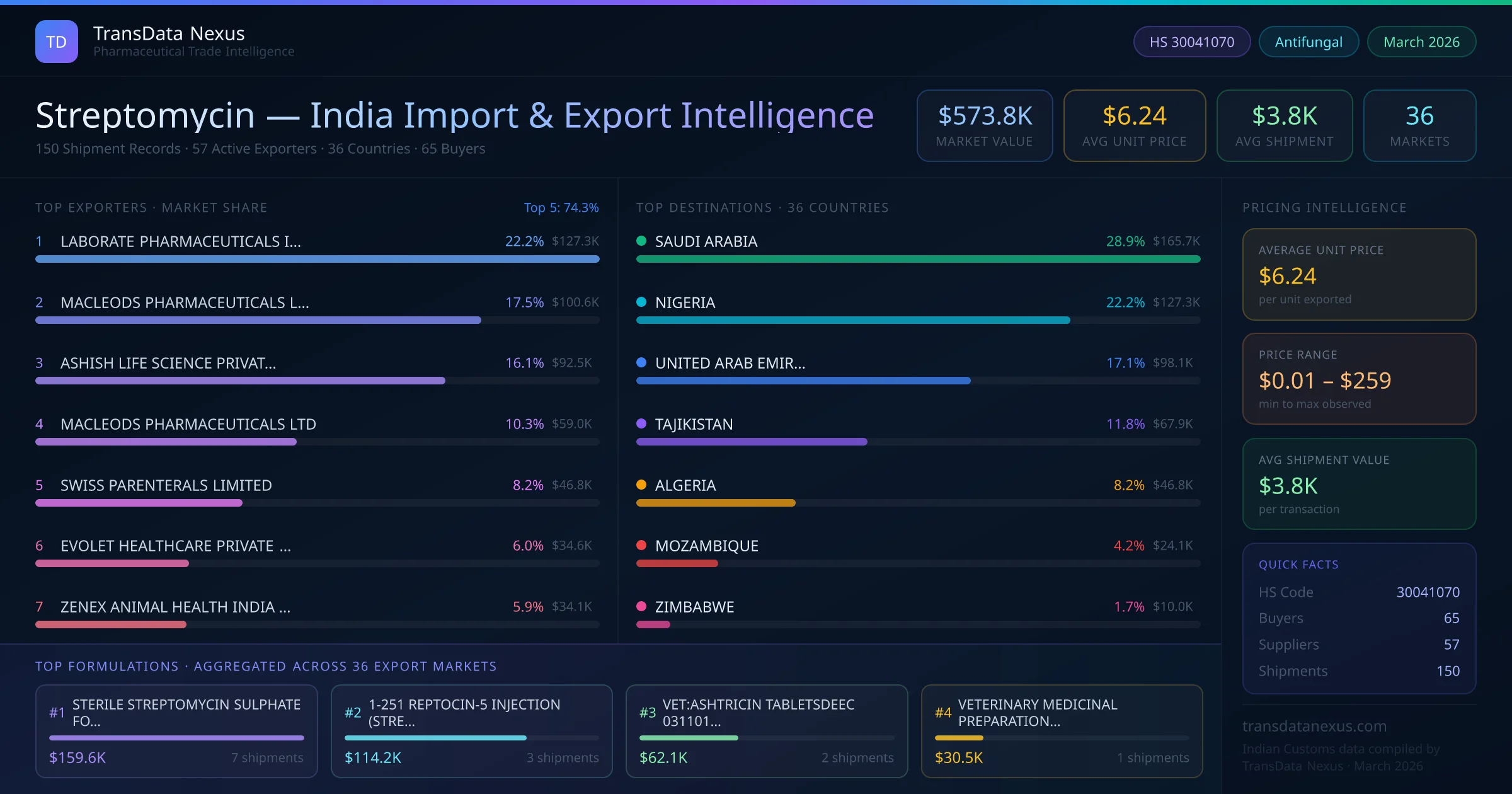 Between 2022 and 2026, India exported $573.8K worth of streptomycin across 150 verified shipments to 36 countries — covering 18% of world markets in the Tuberculosis Medications segment. The largest destination is SAUDI ARABIA (28.9%). LABORATE PHARMACEUTICALS INDIA LTD leads with a 22.2% share. All figures are drawn from Indian Customs (DGFT) shipping bill records spanning four years of trade activity.