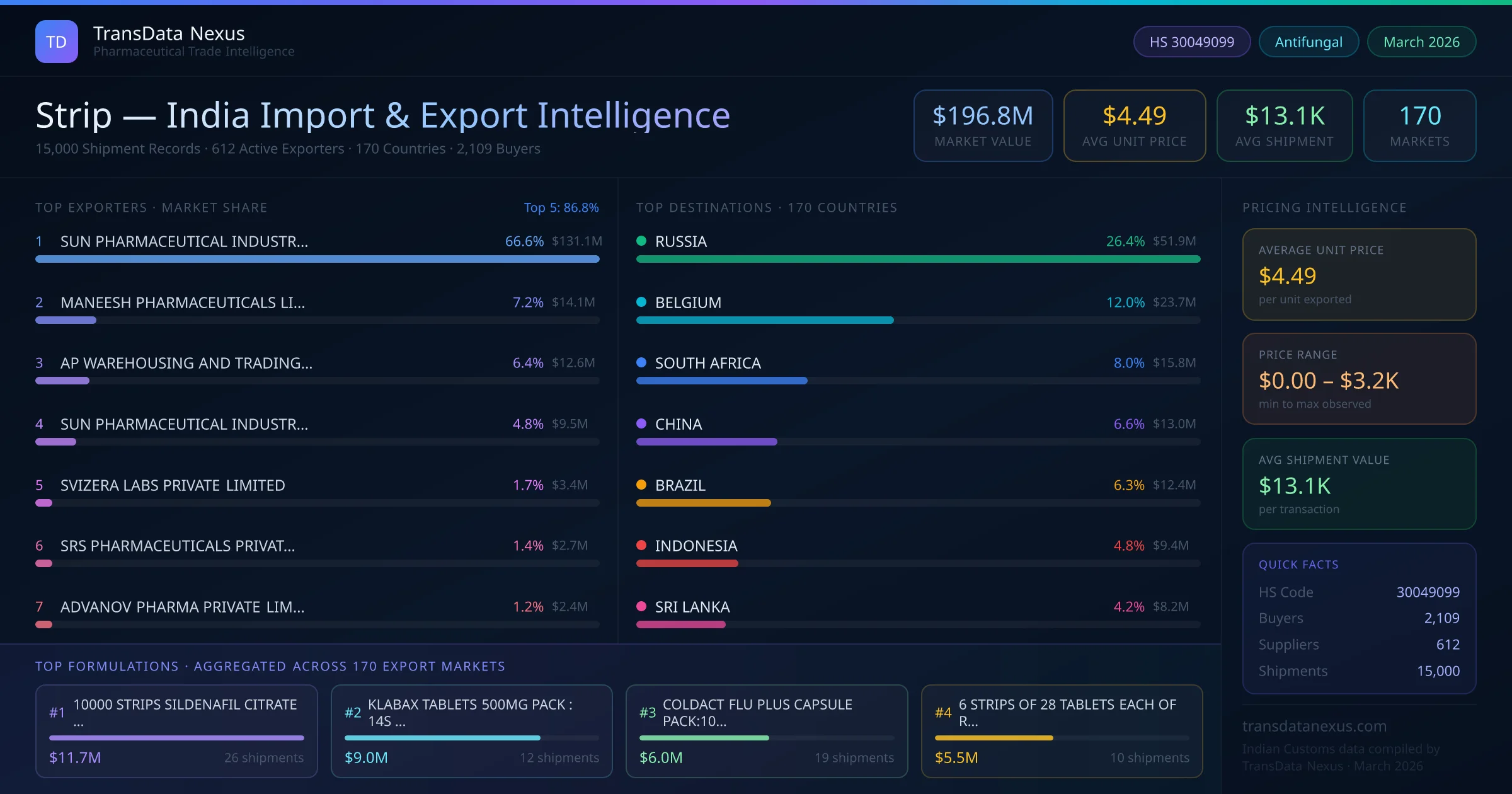 The average unit price for strip exports from India is $4.49 per unit, with prices ranging from $0.00 to $3200.00 depending on formulation and order volume.