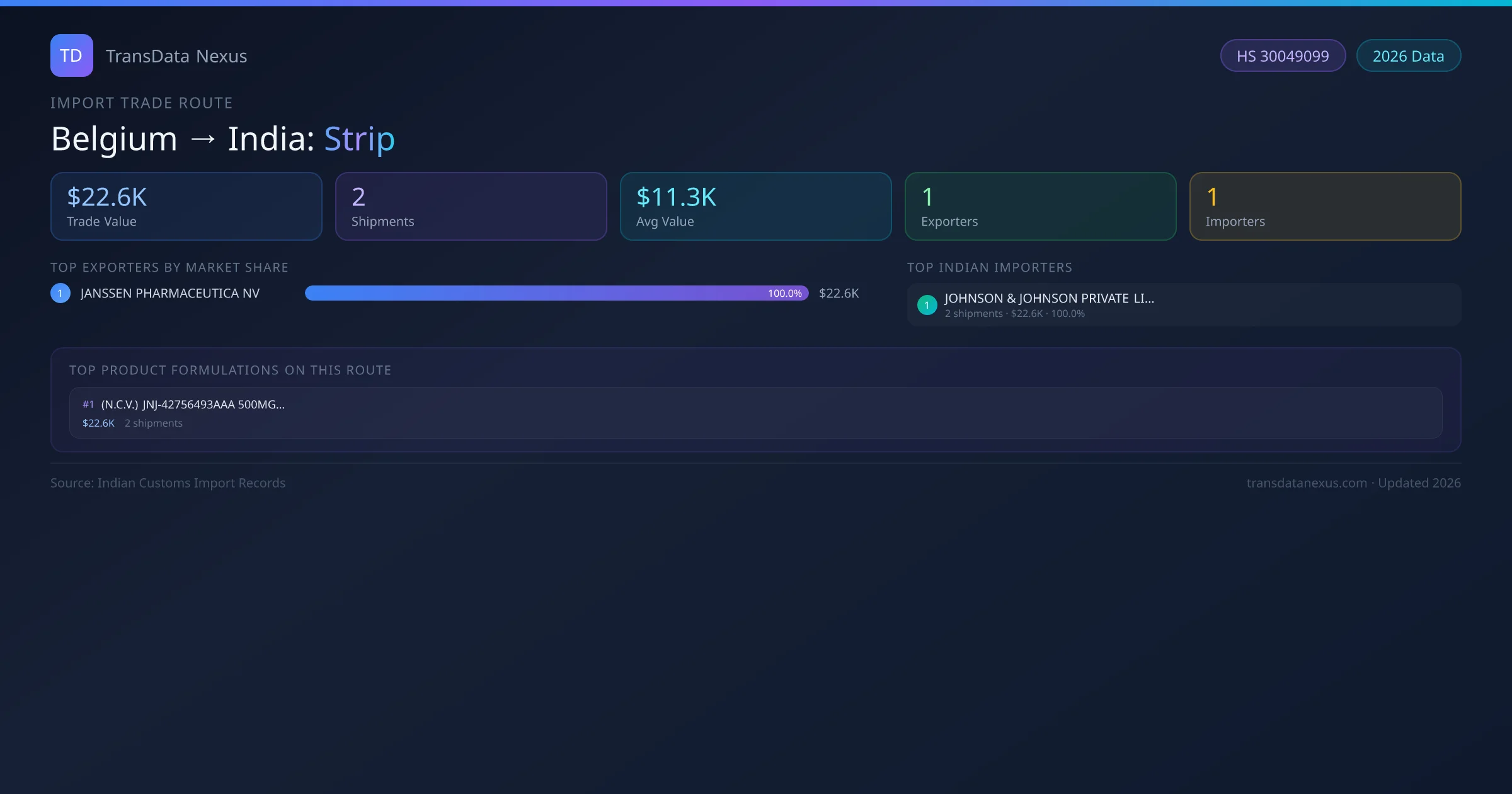 The Belgium to India Strip corridor is one of India's established pharmaceutical import routes from Belgium, with 2 shipments documented worth a combined $22.6K USD. The route is dominated by JANSSEN PHARMACEUTICA NV, which alone accounts for roughly 100% of all import value, reflecting the consolidated nature of Belgium's strip export sector.