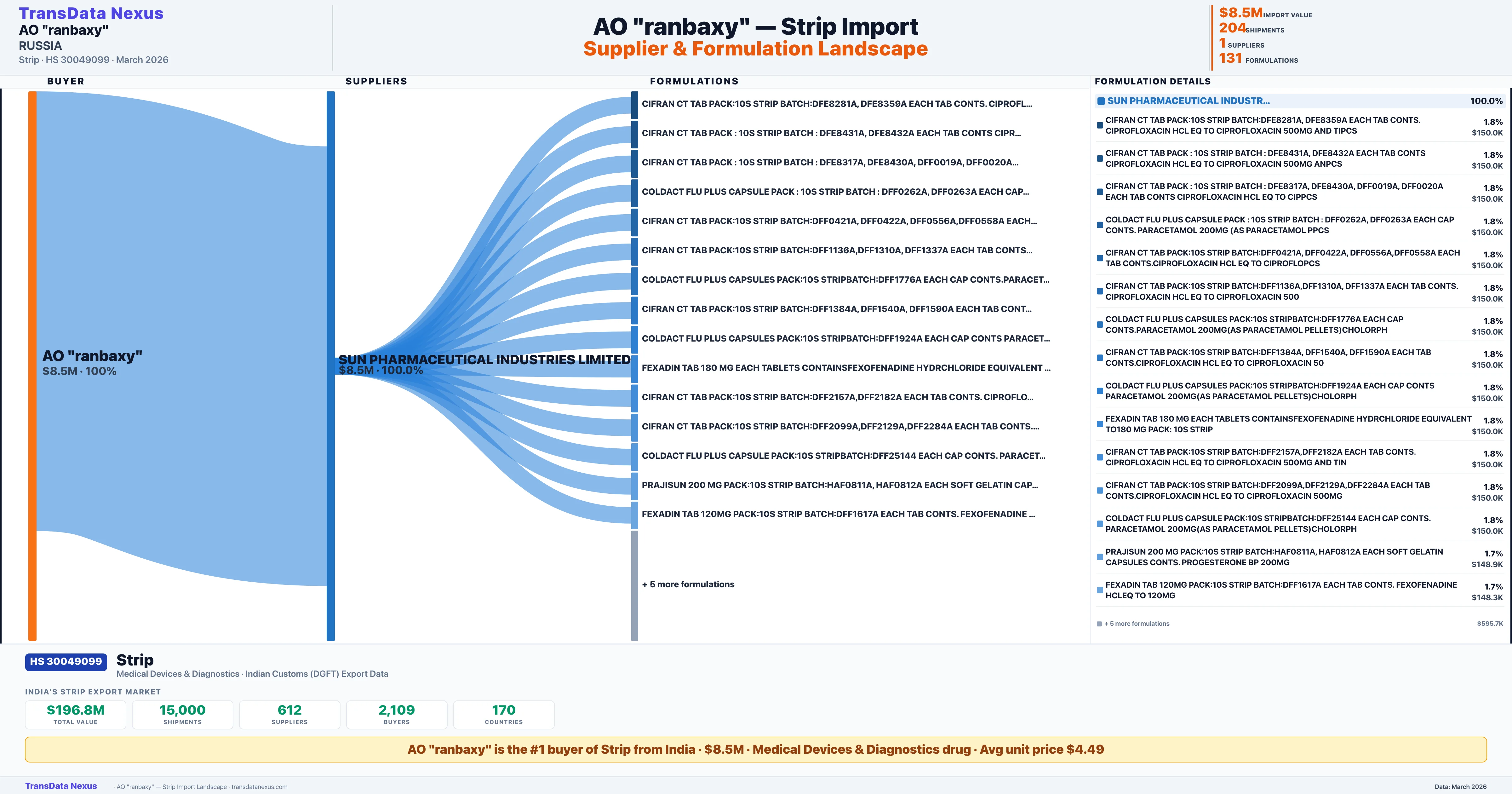 AO RANBAXY sources Strip from 1 verified Indian supplier: SUN PHARMACEUTICAL INDUSTRIES LIMITED ($8.5M, 100.0%). This is based on 204 customs records.