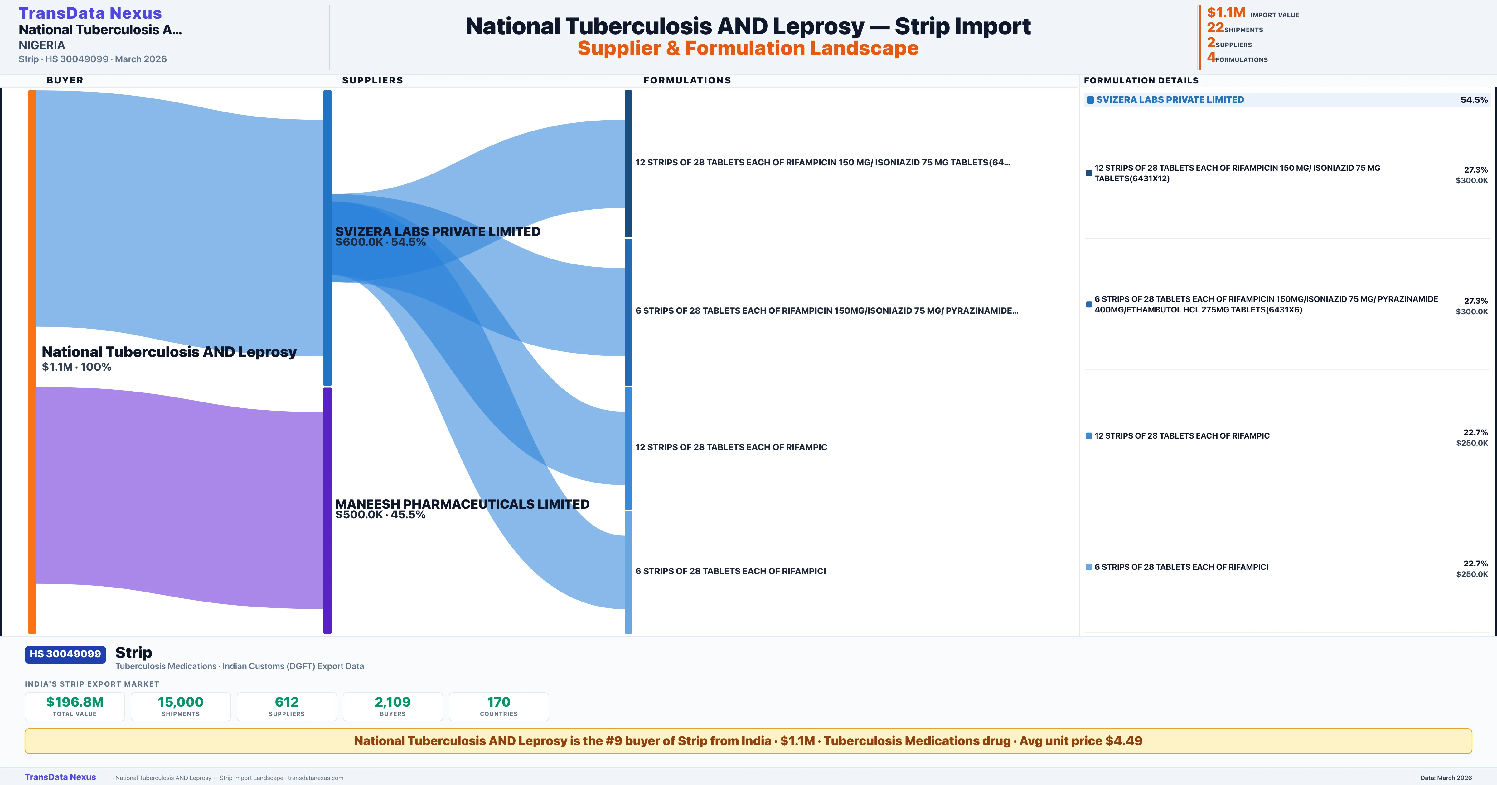 NATIONAL TUBERCULOSIS AND LEPROSY sources Strip from 2 verified Indian suppliers: SVIZERA LABS PRIVATE LIMITED ($600.0K, 54.5%), MANEESH PHARMACEUTICALS LIMITED ($500.0K, 45.5%). This is based on 22 customs records.