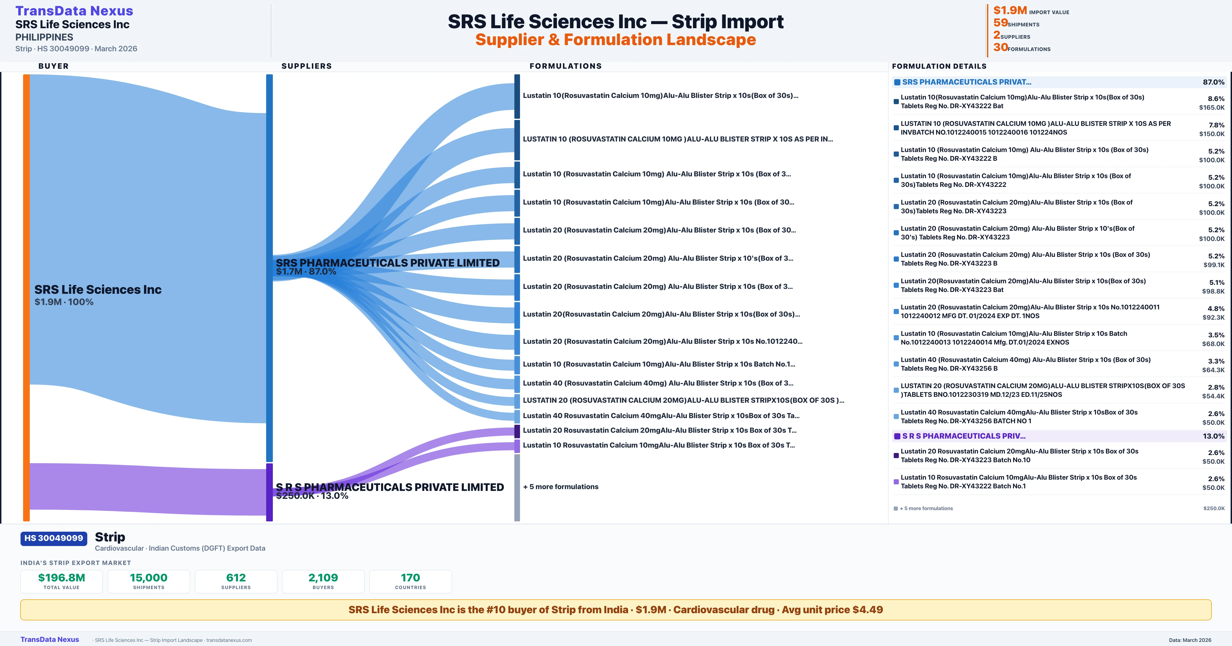 - 5.Verified Records: This page is backed by 59 individual customs records matching SRS LIFE SCIENCES INC importing Strip, covering 30 formulations from 2 verified suppliers.