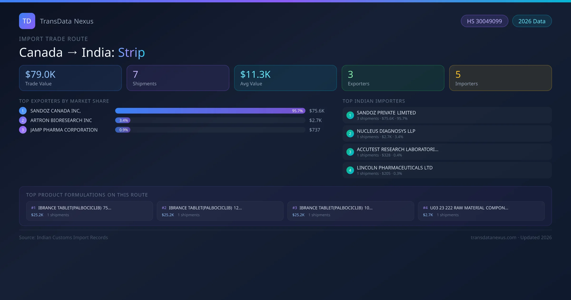 On the receiving end of this trade route, the leading Indian importers of Canada strip include SANDOZ PRIVATE LIMITED , NUCLEUS DIAGNOSYS LLP, ACCUTEST RESEARCH LABORATORIES INDIA PRIVATE LIMIT , LINCOLN PHARMACEUTICALS LTD , LAMBDA THERAPEUTIC RESEARCH LIMITED . The largest importer is SANDOZ PRIVATE LIMITED , accounting for $75.6K USD across 3 shipments — representing 96% of all strip imports from Canada on this route.