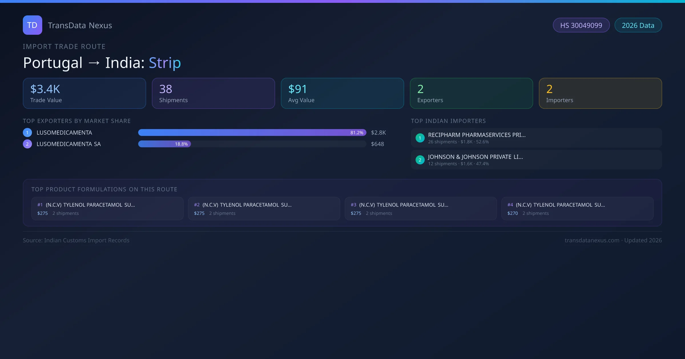 The Portugal to India Strip corridor is one of India's established pharmaceutical import routes from Portugal, with 38 shipments documented worth a combined $3.4K USD. The route is dominated by LUSOMEDICAMENTA , which alone accounts for roughly 81% of all import value, reflecting the consolidated nature of Portugal's strip export sector.