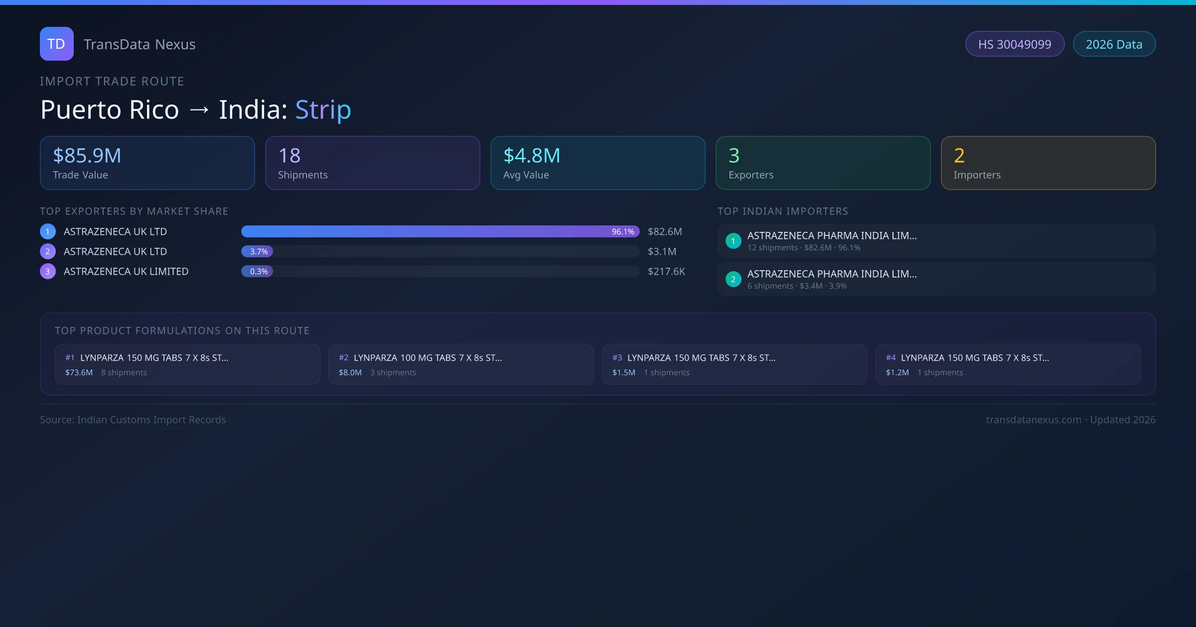 India has recorded 18 verified shipments of Strip imported from Puerto Rico, representing a combined trade value of $85.9M USD. This corridor is served by 3 active Puerto Rico exporters, with an average shipment value of $4.8M USD. The leading Puerto Rico supplier is ASTRAZENECA UK LTD , which accounts for 96% of total import value with 12 shipments worth $82.6M USD. On the buying side, ASTRAZENECA PHARMA INDIA LIMITED is the largest Indian importer with $82.6M USD in purchases. The top 3 suppliers — ASTRAZENECA UK LTD , ASTRAZENECA UK LTD, ASTRAZENECA UK LIMITED — together control 100% of total trade value on this route. All data sourced from Indian Customs (DGFT) shipping bill of entry records. Values reported in FOB USD.