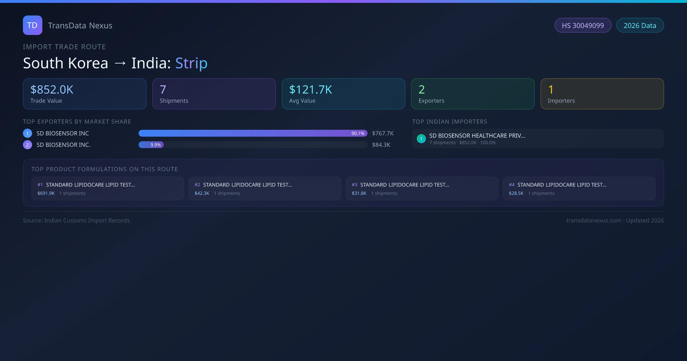 On the buying side, SD BIOSENSOR HEALTHCARE PRIVATE LIMITED is the largest importer with 7 shipments worth $852.0K USD — representing 100% of all strip imports from South Korea on this route.