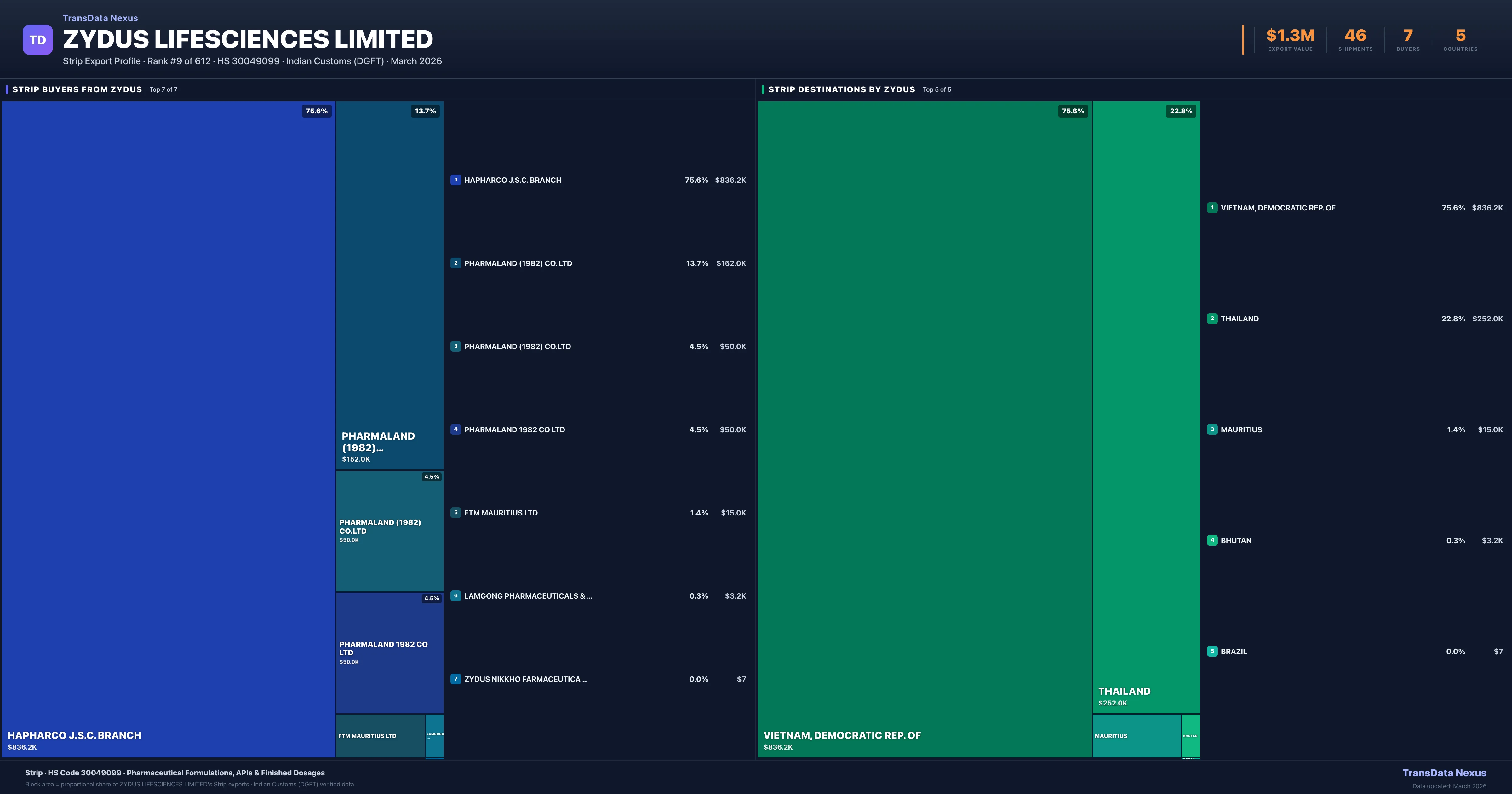 Zydus Lifesciences Limited supplies Strip to 7 buyers globally. The largest buyer is HAPHARCO J.S.C. BRANCH (VIETNAM, DEMOCRATIC REP. OF), followed by PHARMALAND (1982) CO. LTD (THAILAND) and PHARMALAND (1982) CO.LTD (THAILAND). These buyers represent pharmaceutical distributors, hospital groups, and government procurement agencies in their respective markets.