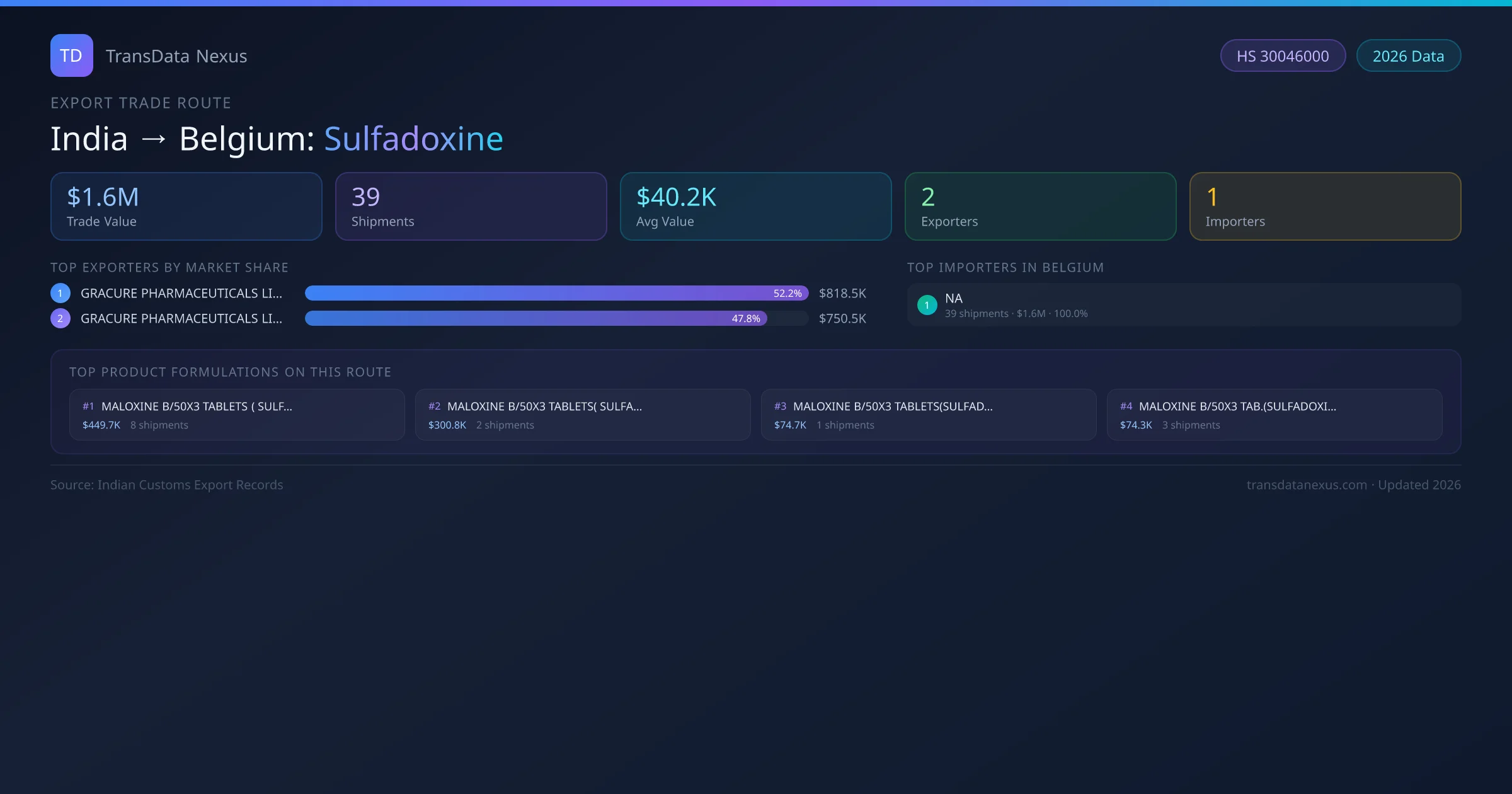 - 1.Route Identification: India to Belgium export trade corridor identified from Indian Customs (DGFT) records for Sulfadoxine.