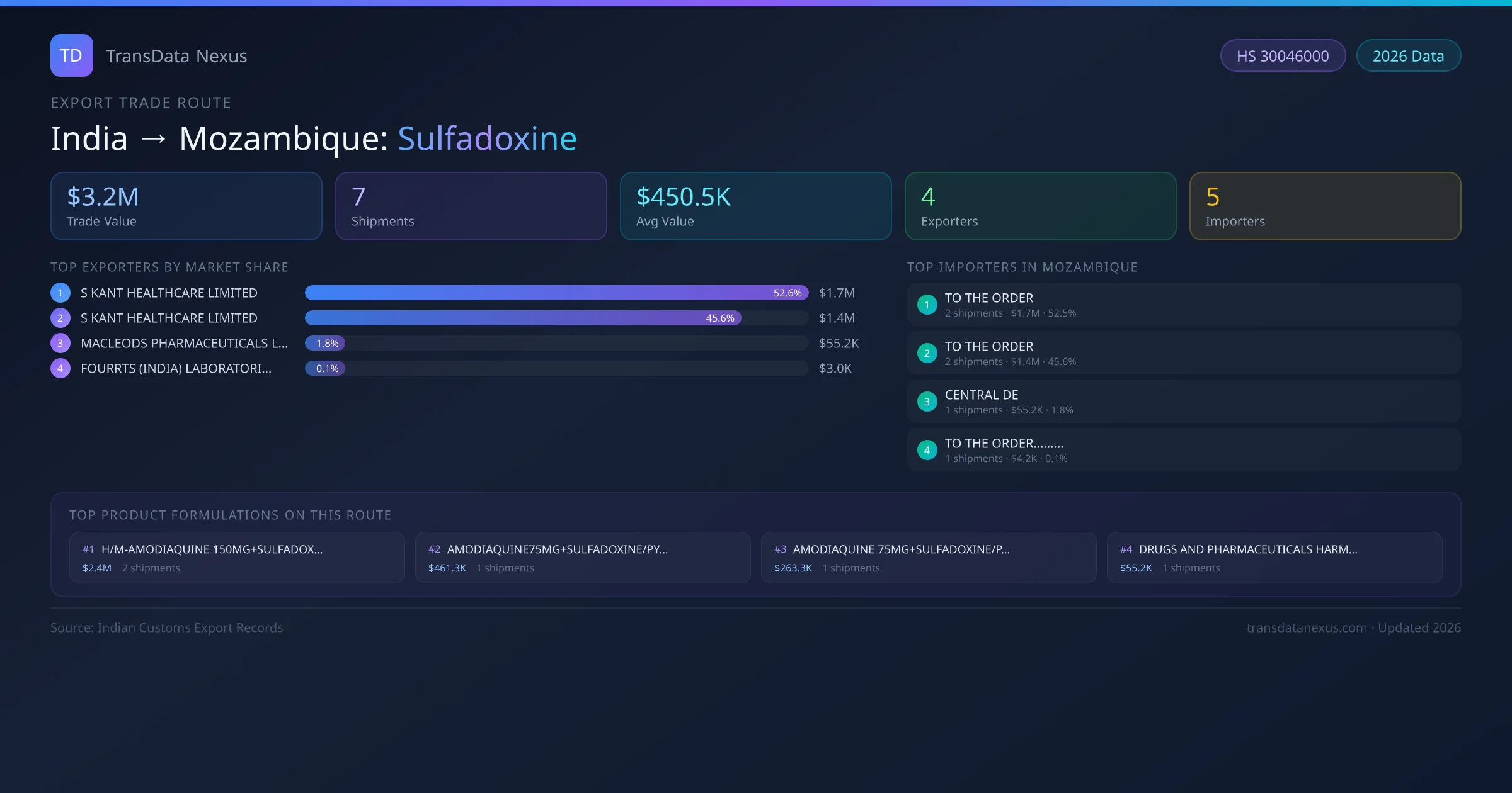 India has recorded 7 verified shipments of Sulfadoxine exported to Mozambique, representing a combined trade value of $3.2M USD. This corridor is served by 4 active Indian exporters, with an average shipment value of $450.5K USD. The leading Indian exporter is S KANT HEALTHCARE LIMITED, which accounts for 53% of total export value with 3 shipments worth $1.7M USD. On the buying side, TO THE ORDER is the largest importer in Mozambique with $1.7M USD in purchases. The top 3 suppliers — S KANT HEALTHCARE LIMITED, S KANT HEALTHCARE LIMITED , MACLEODS PHARMACEUTICALS LIMITED — together control 100% of total trade value on this route. All data sourced from Indian Customs (DGFT) shipping bill records. Values reported in FOB USD.