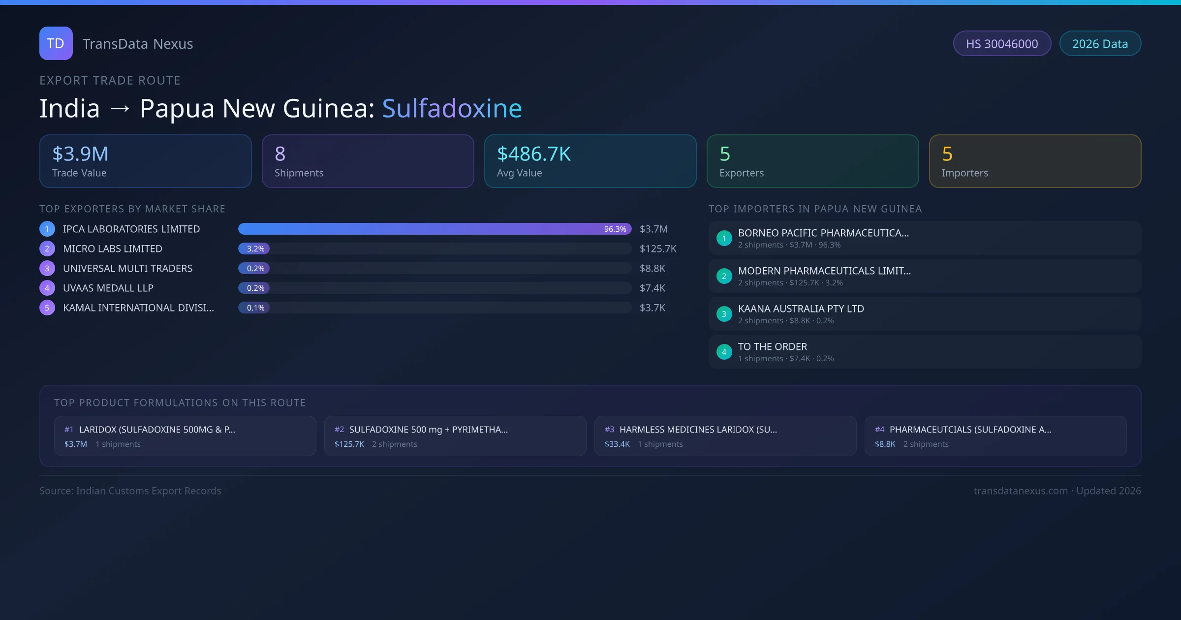 India has recorded 8 verified shipments of Sulfadoxine exported to Papua New Guinea, representing a combined trade value of $3.9M USD. This corridor is served by 5 active Indian exporters, with an average shipment value of $486.7K USD. The leading Indian exporter is IPCA LABORATORIES LIMITED, which accounts for 96% of total export value with 2 shipments worth $3.7M USD. On the buying side, BORNEO PACIFIC PHARMACEUTICALS LTD is the largest importer in Papua New Guinea with $3.7M USD in purchases. The top 3 suppliers — IPCA LABORATORIES LIMITED, MICRO LABS LIMITED , UNIVERSAL MULTI TRADERS — together control 100% of total trade value on this route. All data sourced from Indian Customs (DGFT) shipping bill records. Values reported in FOB USD.