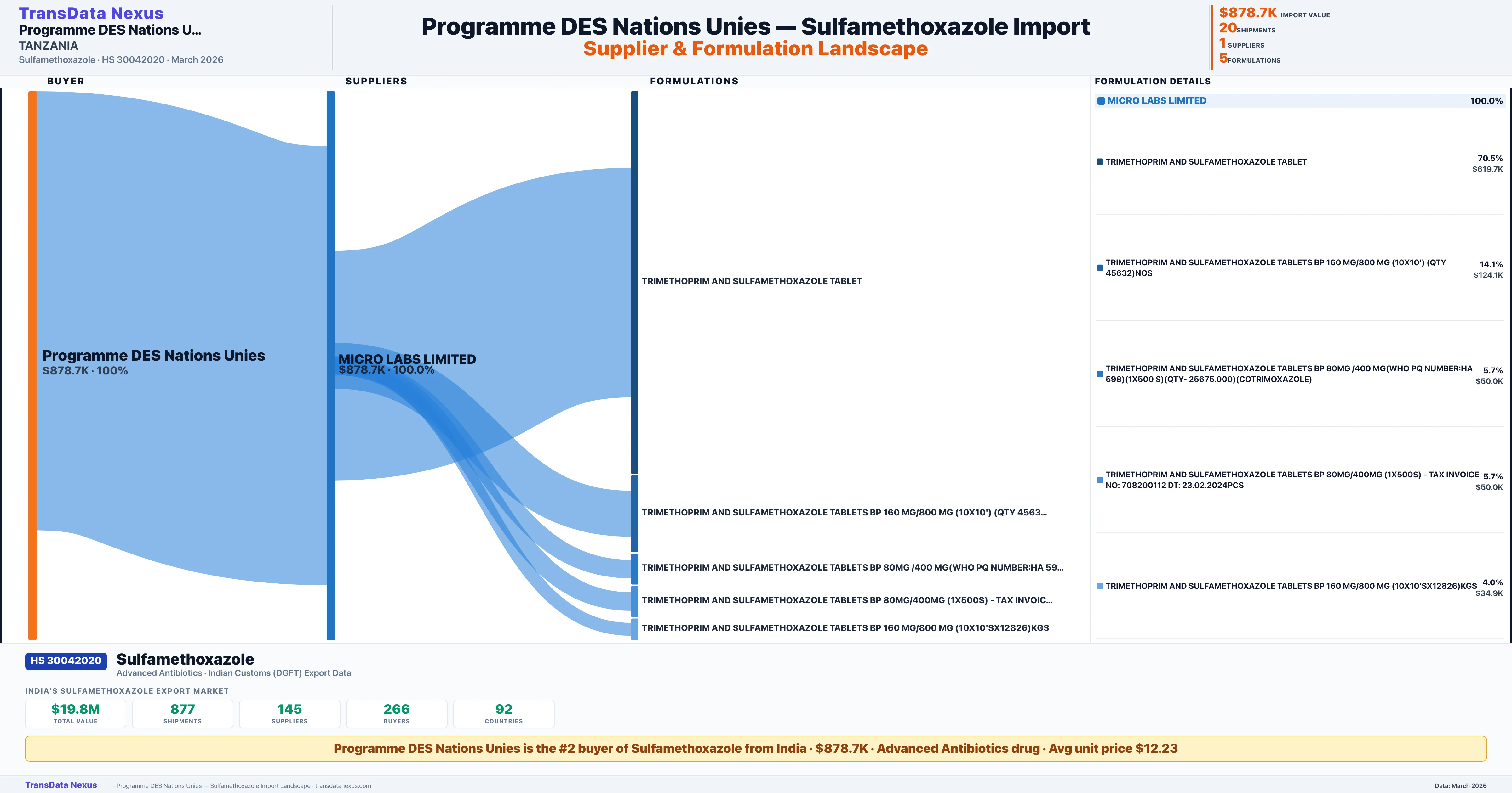 PROGRAMME DES NATIONS UNIES sources Sulfamethoxazole from 1 verified Indian supplier: MICRO LABS LIMITED ($878.7K, 100.0%). This is based on 20 customs records.