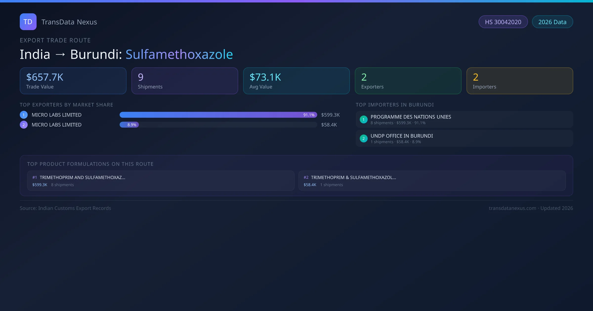 The India to Burundi Sulfamethoxazole corridor is one of India's established pharmaceutical export routes, with 9 shipments documented worth a combined $657.7K USD. The route is dominated by MICRO LABS LIMITED, which alone accounts for roughly 91% of all export value, reflecting the consolidated nature of India's sulfamethoxazole manufacturing sector.
