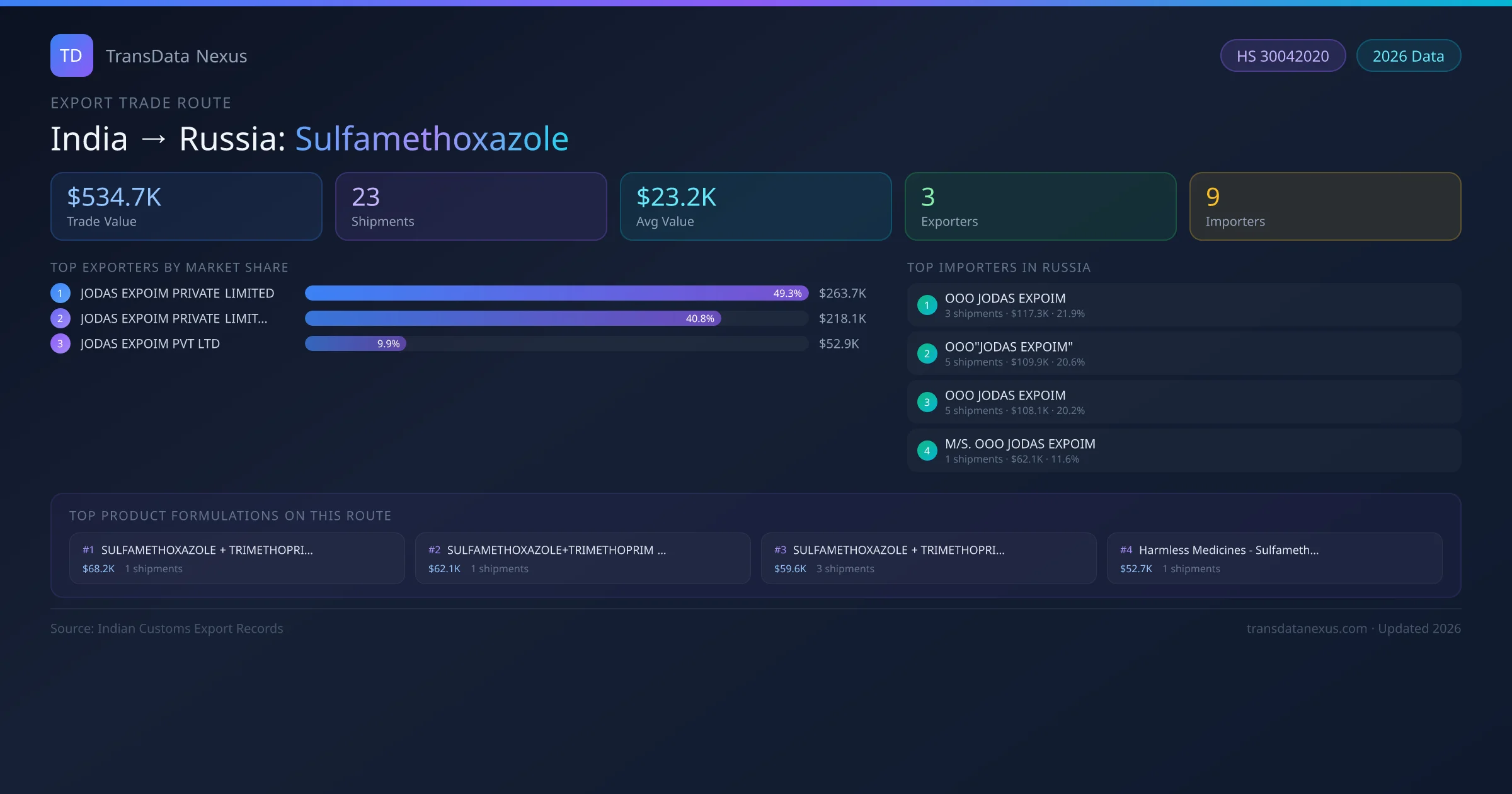 - 1.Route Identification: India to Russia export trade corridor identified from Indian Customs (DGFT) records for Sulfamethoxazole.