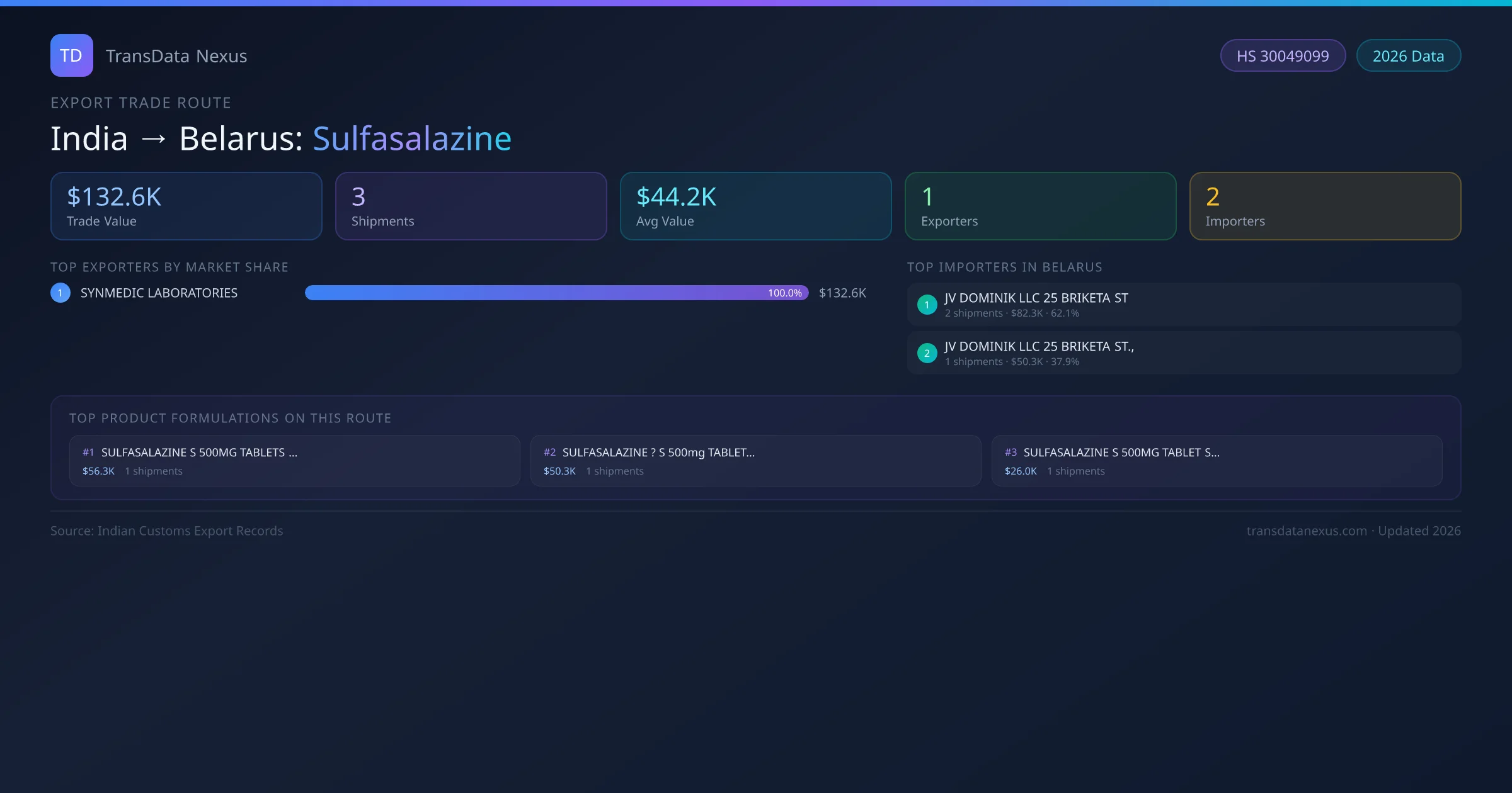 India has recorded 3 verified shipments of Sulfasalazine exported to Belarus, representing a combined trade value of $132.6K USD. This corridor is served by 1 active Indian exporters, with an average shipment value of $44.2K USD. The leading Indian exporter is SYNMEDIC LABORATORIES, which accounts for 100% of total export value with 3 shipments worth $132.6K USD. On the buying side, JV DOMINIK LLC 25 BRIKETA ST is the largest importer in Belarus with $82.3K USD in purchases. All data sourced from Indian Customs (DGFT) shipping bill records. Values reported in FOB USD.