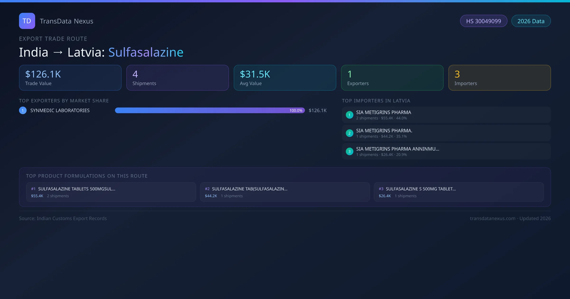 The India to Latvia Sulfasalazine corridor is one of India's established pharmaceutical export routes, with 4 shipments documented worth a combined $126.1K USD. The route is dominated by SYNMEDIC LABORATORIES, which alone accounts for roughly 100% of all export value, reflecting the consolidated nature of India's sulfasalazine manufacturing sector.