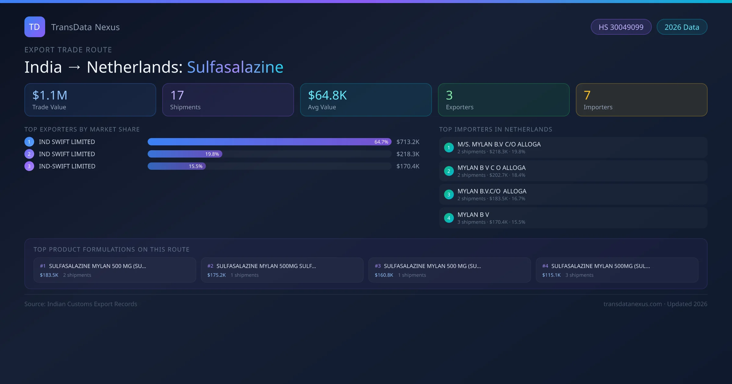 India has recorded 17 verified shipments of Sulfasalazine exported to Netherlands, representing a combined trade value of $1.1M USD. This corridor is served by 3 active Indian exporters, with an average shipment value of $64.8K USD. The leading Indian exporter is IND SWIFT LIMITED, which accounts for 65% of total export value with 12 shipments worth $713.2K USD. On the buying side, M/S. MYLAN B.V C/O ALLOGA is the largest importer in Netherlands with $218.3K USD in purchases. The top 3 suppliers — IND SWIFT LIMITED, IND SWIFT LIMITED , IND-SWIFT LIMITED — together control 100% of total trade value on this route. All data sourced from Indian Customs (DGFT) shipping bill records. Values reported in FOB USD.