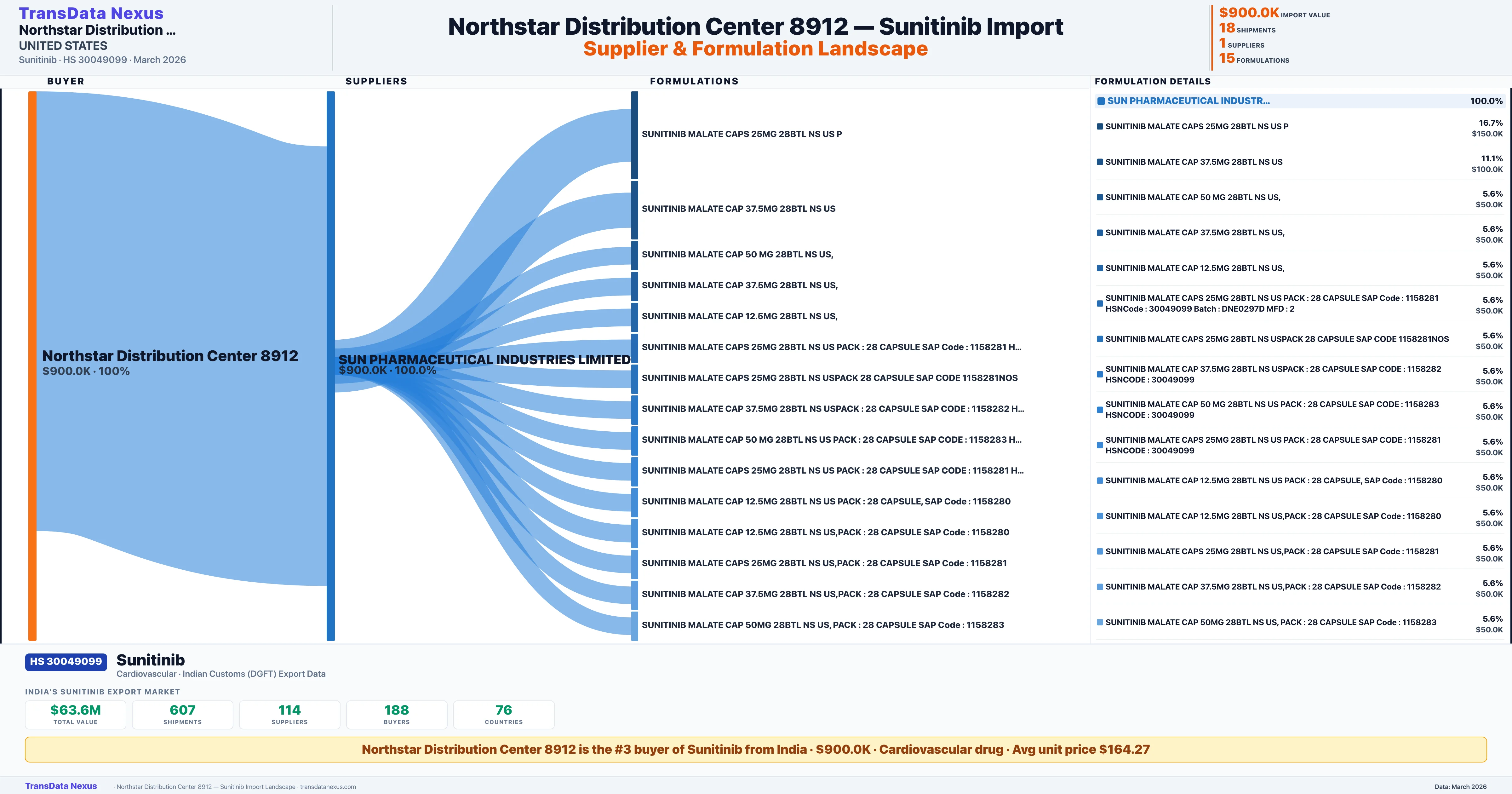 NORTHSTAR DISTRIBUTION CENTER 8912 sources Sunitinib from 1 verified Indian supplier: SUN PHARMACEUTICAL INDUSTRIES LIMITED ($900.0K, 100.0%). This is based on 18 customs records.