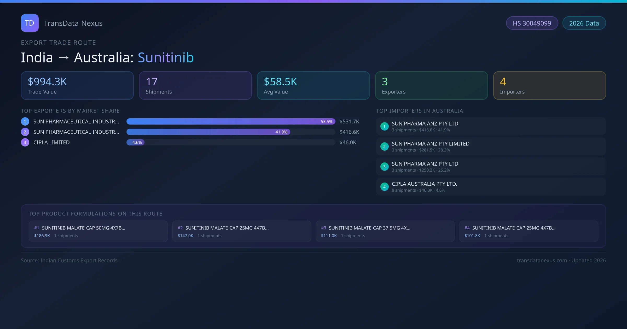 India exports Sunitinib to Australia worth approximately $994.3K USD across 17 recorded shipments. The average value per shipment is $58.5K USD.