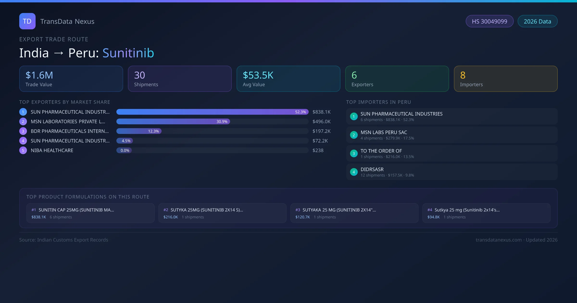 - 1.Route Identification: India to Peru export trade corridor identified from Indian Customs (DGFT) records for Sunitinib.