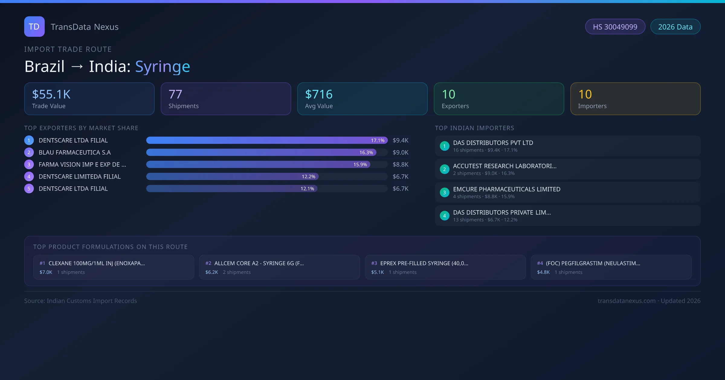 On the buying side, DAS DISTRIBUTORS PVT LTD is the largest importer with 16 shipments worth $9.4K USD — representing 17% of all syringe imports from Brazil on this route. A total of 10 buyers are active on this corridor.