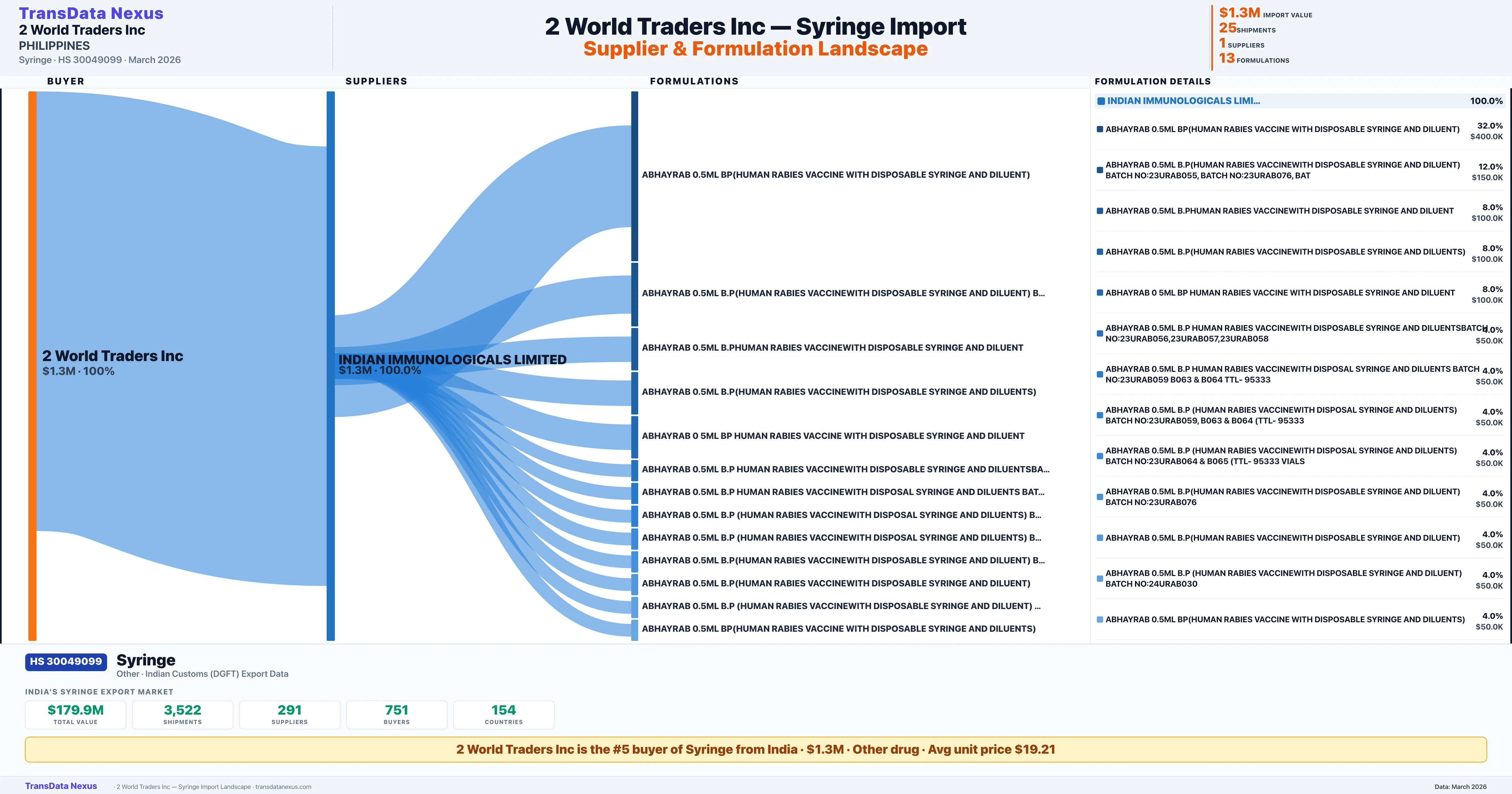 2 WORLD TRADERS INC sources Syringe from 1 verified Indian supplier: INDIAN IMMUNOLOGICALS LIMITED ($1.3M, 100.0%). This is based on 25 customs records.